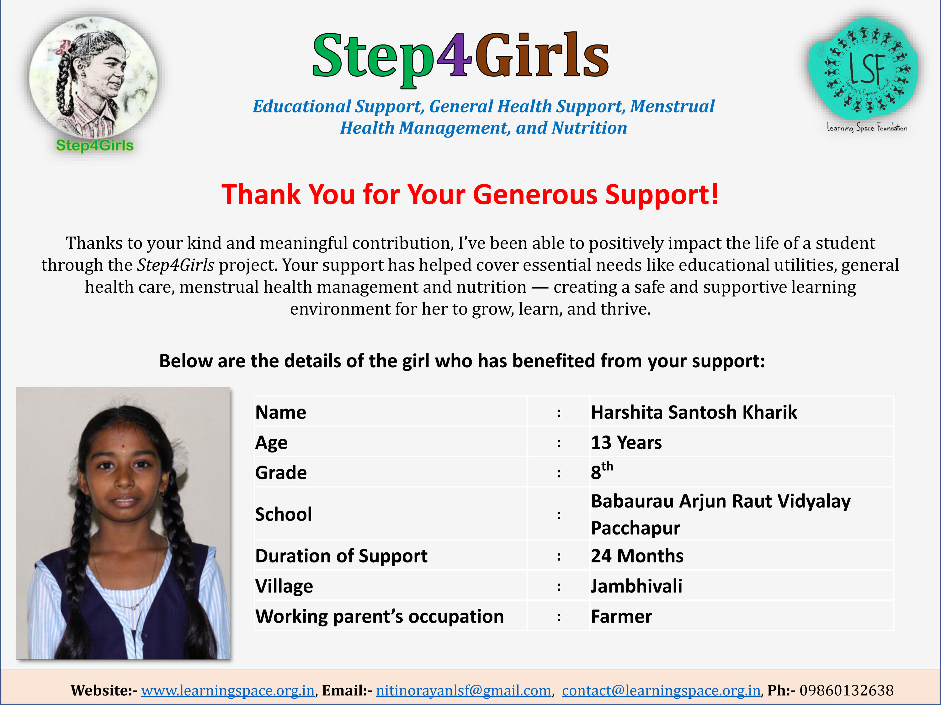 To ensure that there is complete transparency, the team at Learning Space Foundation will post feedback about 2-3 months after the campaign is over telling us which student benefitted from the funding. The details will then be posted on the UPDATES section of my campaign and will be in a format like the one below. Once the update is posted the platform will send an EMAIL alert to you. Click on the link and you can read about which child has benefitted. That's transparent, right?