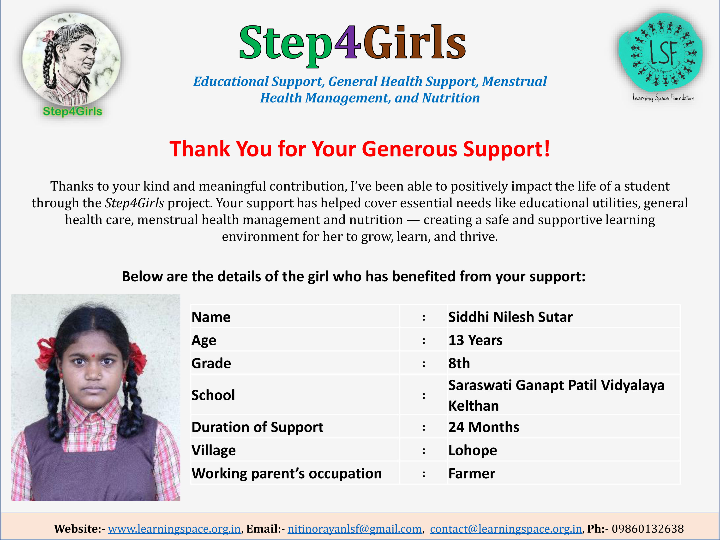 To ensure that there is complete transparency, the team at Learning Space Foundation will post feedback about 2-3 months after the campaign is over telling us which student benefitted from the funding. The details will then be posted on the UPDATES section of my campaign and will be in a format like the one below. Once the update is posted the platform will send an EMAIL alert to you. Click on the link and you can read about which child has benefitted. That's transparent, right?