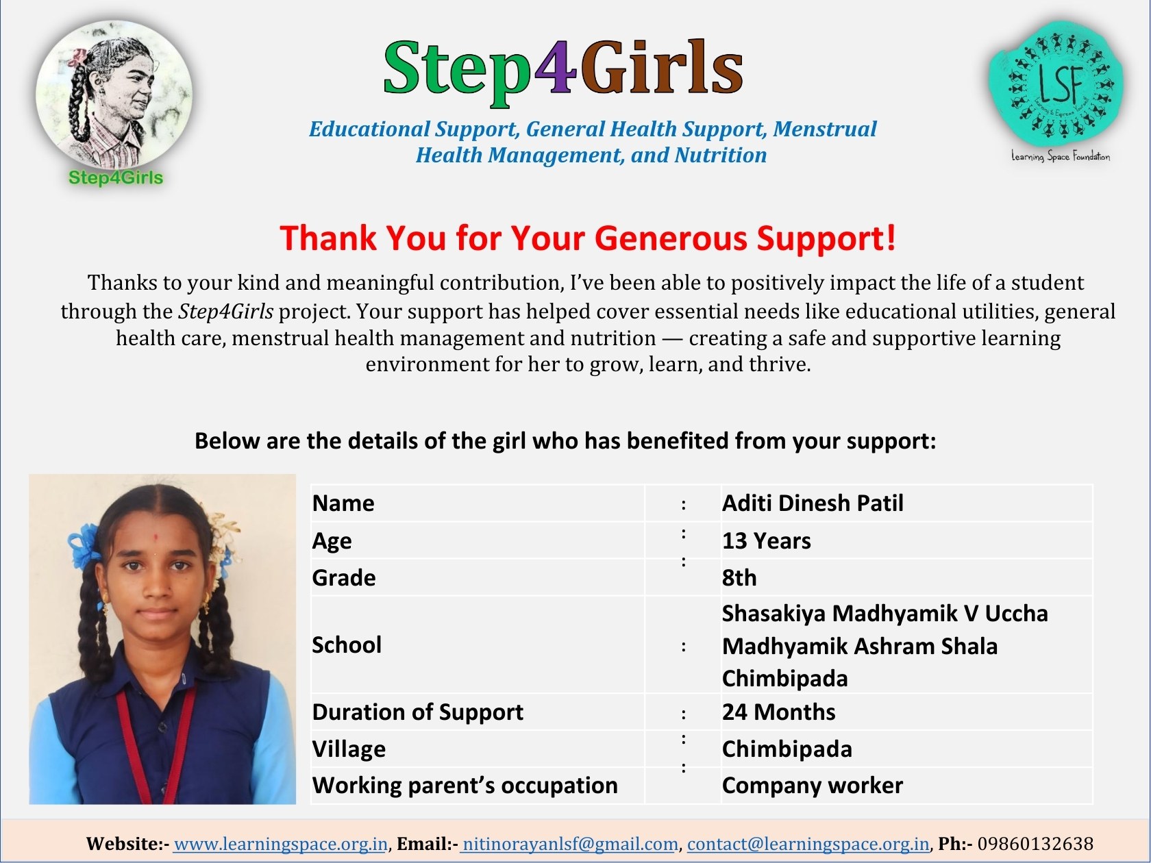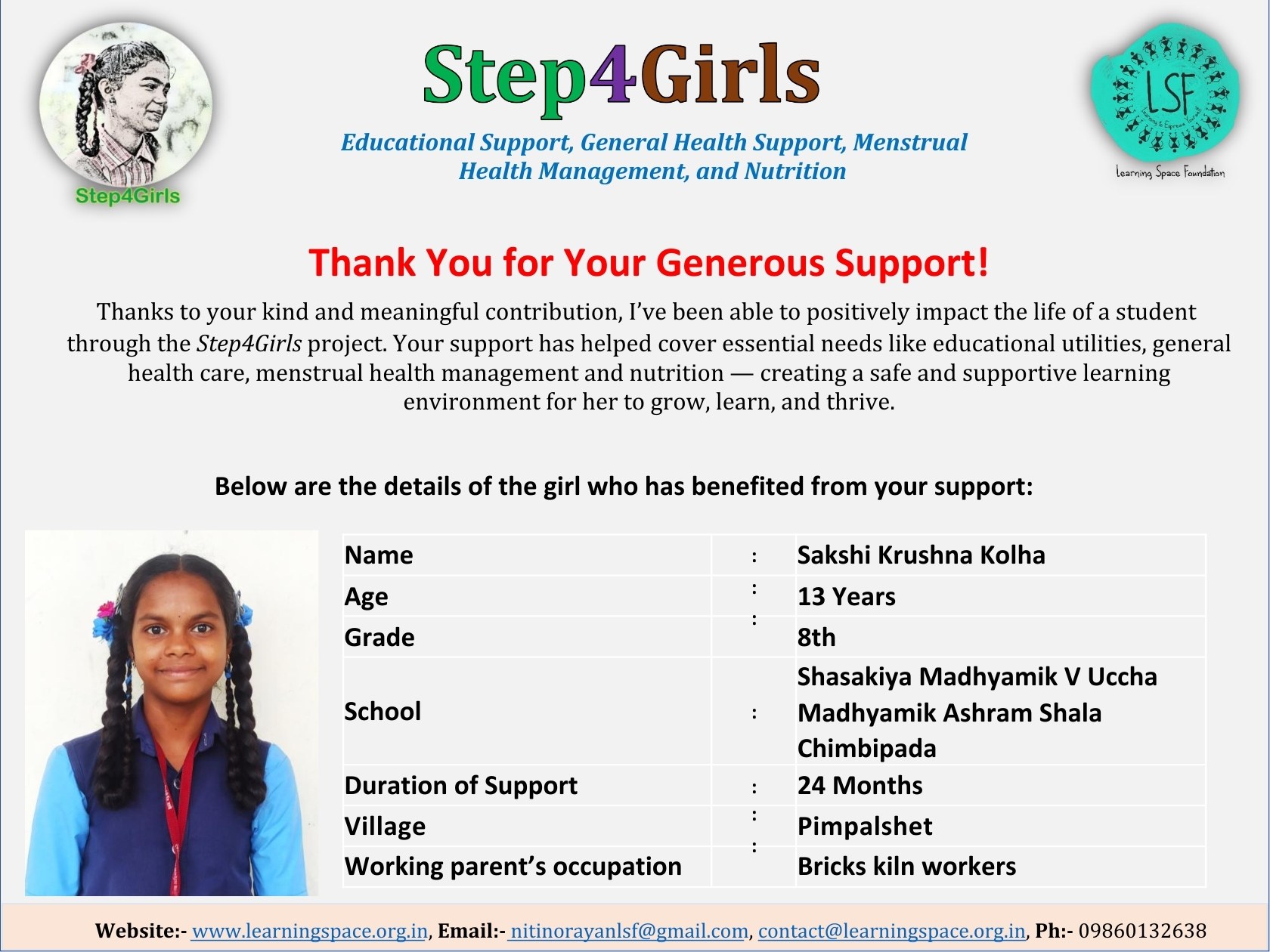 To ensure that there is complete transparency, the team at Learning Space Foundation will post feedback about 2-3 months after the campaign is over telling us which student benefitted from the funding. The details will then be posted on the UPDATES section of my campaign and will be in a format like the one below. Once the update is posted the platform will send an EMAIL alert to you. Click on the link and you can read about which child has benefitted. That's transparent, right?
