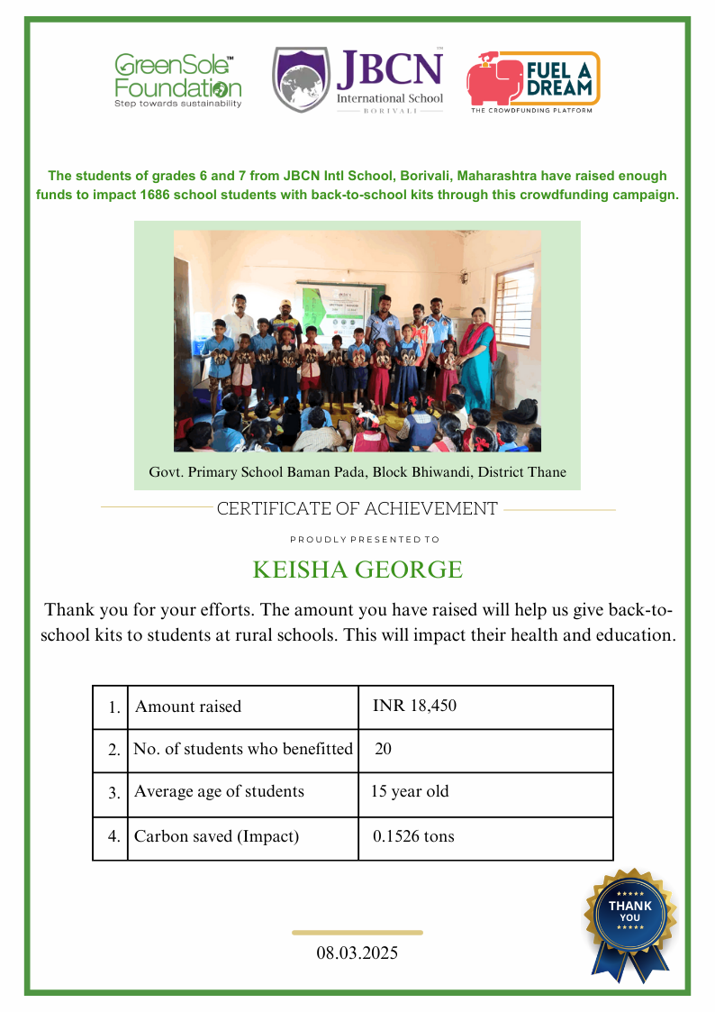 My name is Keisha George. I am 11-years-old and a Grade 6 student at the JBCN International School, Borivali.