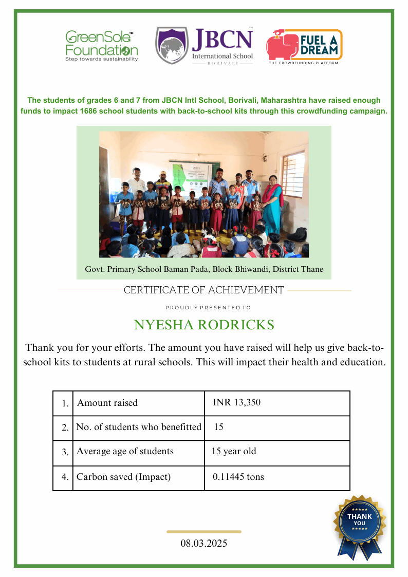 My name is Nyesha Rodricks. I am 11-years-old and a Grade 6 student at the JBCN International School, Borivali.