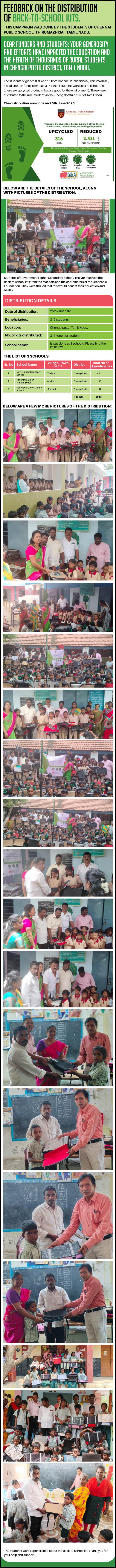 If more funds are raised, the back-to-school kits will be distributed to more schools in Tamil Nadu.