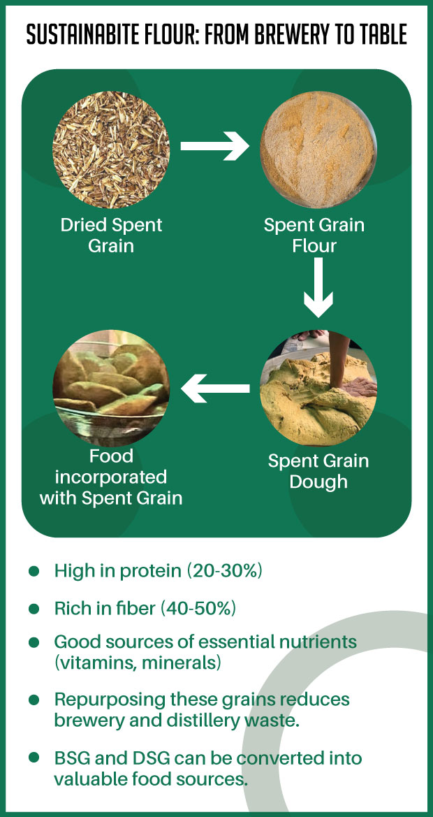 Our groundbreaking approach transforms Brewer's Spent Grain (BSG- leftover grains from beer brewing) and Distiller's Spent Grain (DSG- leftover grains from alcohol distillation) - nutritious by-products of beer brewing and alcohol distillation - into fortified flour. BSG and DSG are rich in protein, fiber, and essential nutrients but are typically discarded as waste.