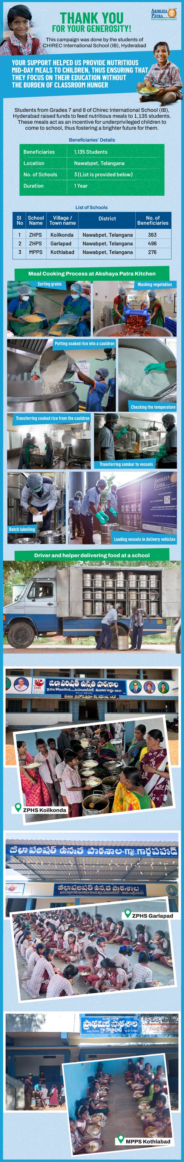 To ensure that there is complete transparency I shall get a report from the NGO (this takes between 2 to 4 months usually after the funds are raised and transferred to them) telling me who benefitted from the funding. The details will then be posted from Akshaya Patra in the UPDATES section of my campaign. As soon as I post an update, the platform will send an EMAIL alert to all the funders - i.e. to you. Click on the link on the email and you can read about who benefitted. That's transparent, right?