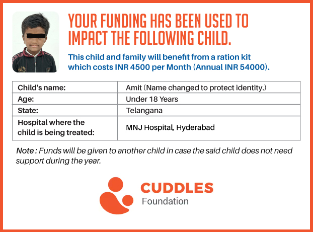 This campaign of mine is being done in partnership with the NGO -Cuddles Foundation and aims to fight hunger and malnutrition in children from low-income homes by giving them a MONTHLY RATION BASKET. This improves their chance of survival by 70% and ultimately does save lives. The baskets are given to children at the Basavatarakam Indo-American Cancer Hospital and MNJ Hospital for Oncology in Hyderabad.