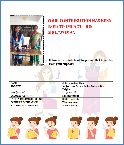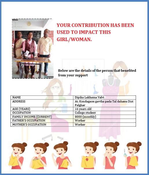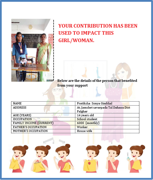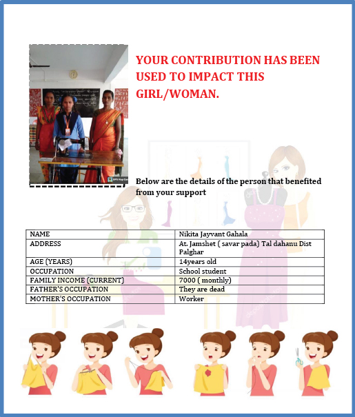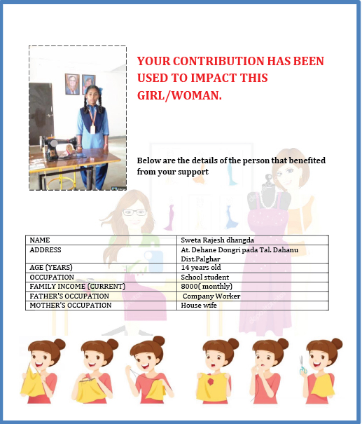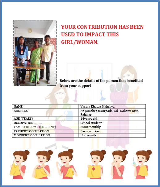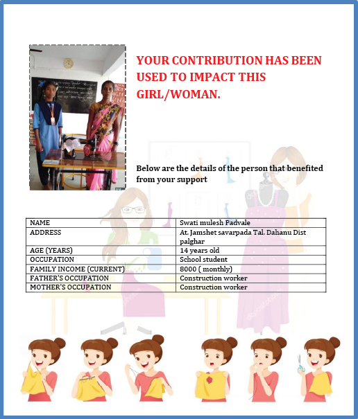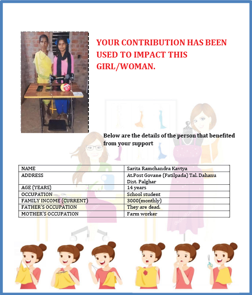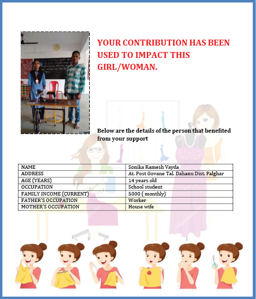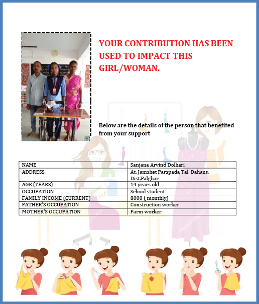 I am doing this campaign to help these young girls and women and give them a livelihood. The beneficiaries are mainly in the Palghar district of Maharashtra (located about 100 km from Mumbai). This will give them a sustainable livelihood by providing them with suitable training in fashion and giving them sewing machines. This will completely transform their lives and also impact their families.
