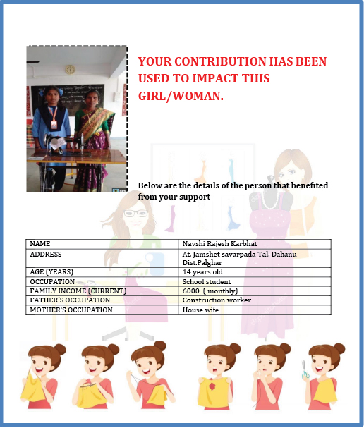 The Inner Wheel Club of Bombay's Queen's Necklace are partnering with the SAMTA FOUNDATION to execute this initiative. They are committed to helping these young girls and women. They will provide fashion design and tailoring expertise plus provide sewing machines to these young girls and women upon completion of the training. Each young girl and woman would receive a kit consisting of a sewing machine and a stand.
