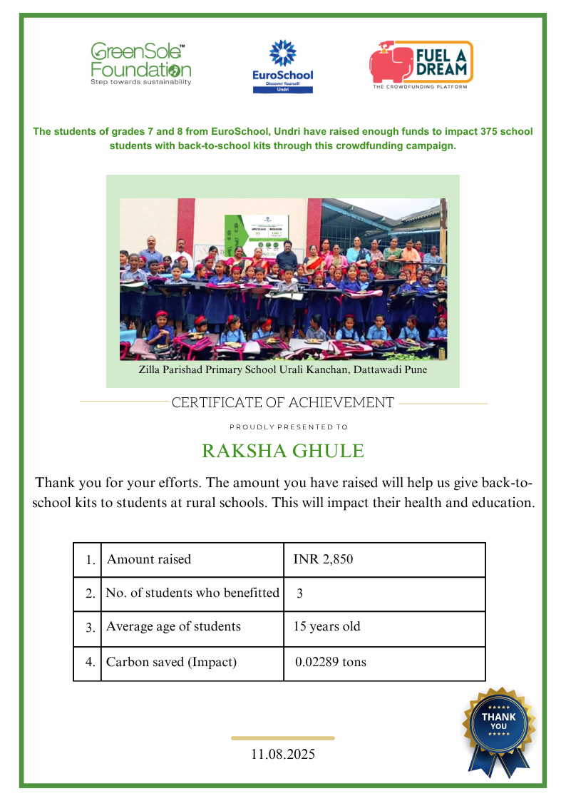 My name is Raksha Ghule. I am 13 years old and a Grade 7 student at the EuroSchool, Undri, Pune.