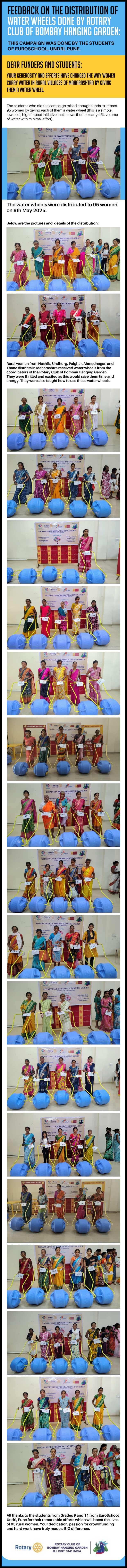 Please support my campaign and let us together bring joy to more women in these tribal areas. The Water wheels will be distributed by the team from the Rotary Club of Hanging Gardens with their local partners. The cost of doing this (including identifying the women, the cost of the water wheel, and the actual distribution ) is only INR 3000 per water wheel making it truly a revolutionary idea. Let's together impact and change the lives of these women in rural areas of Maharashtra.