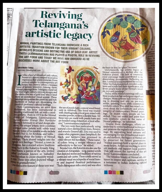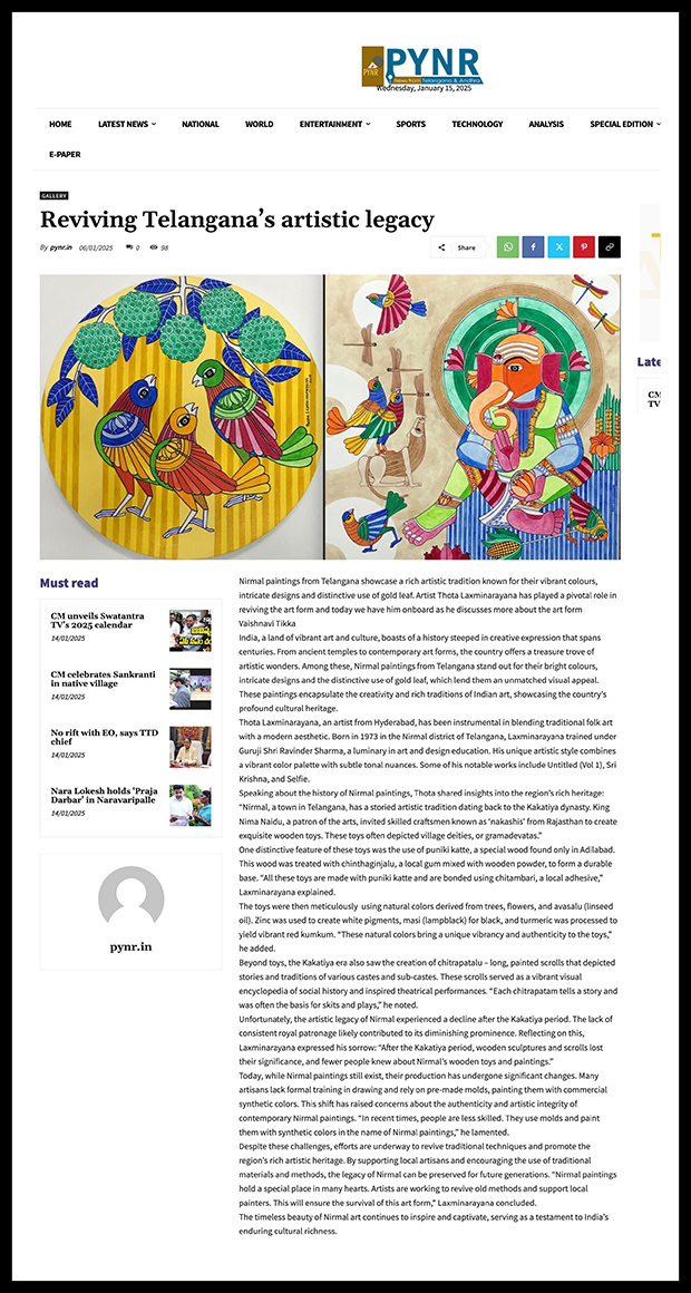 I was born in 1973, in Nirmal, Adilabad District, Telangana. I was tutored under Guruji-Shri Ravinder Sharma (a revered name in the art and design schools of the country), who brought the native charm of folk art into contemporary style. I have participated in several group shows, solo shows, and camps in India and abroad. I have done a few IT company workshops. I was invited by the Indian School of Business, Hyderabad, for a short residency in 2010 and illustrated the ISB buildings in both Hyderabad and Mohali for their 2016 calendar. In the year 2020, I made a painting as a flag for the ISB 20th anniversary, which was inaugurated by PM Narendra Modi and also took part in the ISB National Art Camp 2023. I worked as a resident artist at the Daira Centre for Arts and Culture. I did live painting on Mercedes-Benz (E-Class and S-Class) in several cities in India. I did art awareness programmes in affordable schools in Hyderabad. I live and work in Hyderabad.