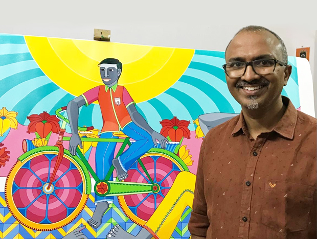 Artist Statement: "In my own stylised vocabulary which is rooted deeply in the Indian folk tradition, I experiment to contemporise the rural idiom. Without diluting the essence of my environment I capture cultural documentation in my works. The serene-looking folks in my paintings are executed in a rich matrix of lines. Although portrayed in a vibrant palette, the colour scheme in my work is highly contemporary. My spectator never finds a dull moment, as each canvas is a social documentary of life. I also portray humans coexisting with the flora and fauna which are indicators of green lives living in harmony. But, lately, after my shift to the city, I depict the urban settlement with my rural sentiments.
