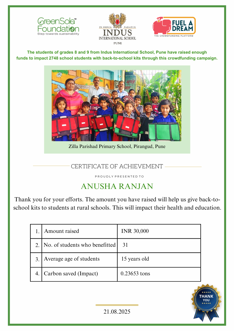 Hello! I’m Anusha Ranjan, a 13-year-old grade 8 student at Indus International School Pune.