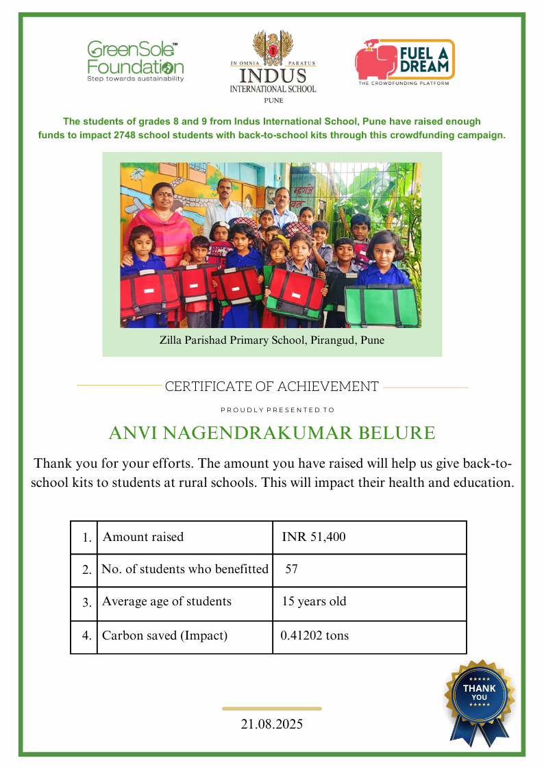 My name is ANVI NAGENDRAKUMAR BELURE. I am 14 years old and a Grade 9 students at Indus International School, Pune.