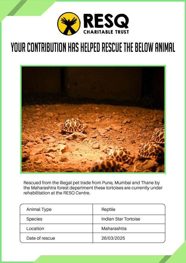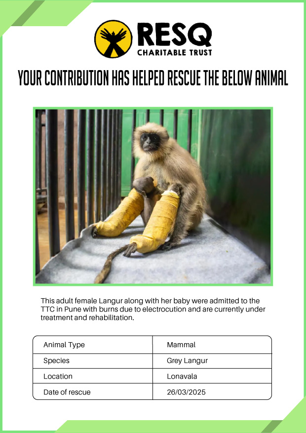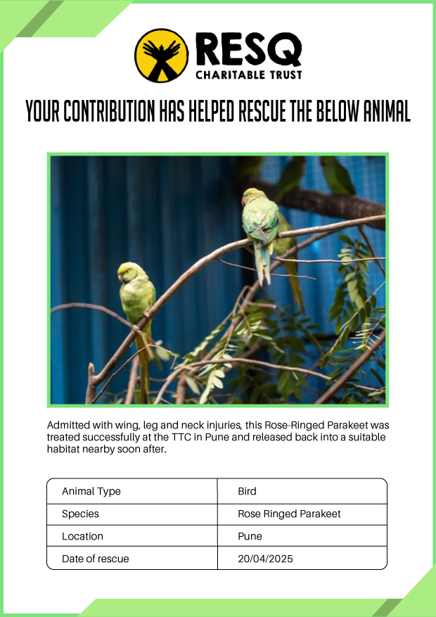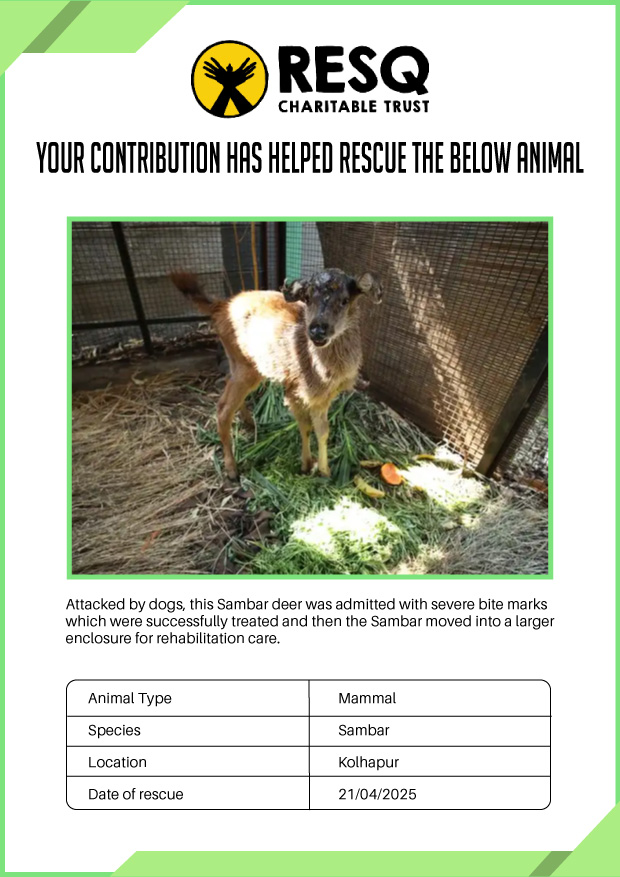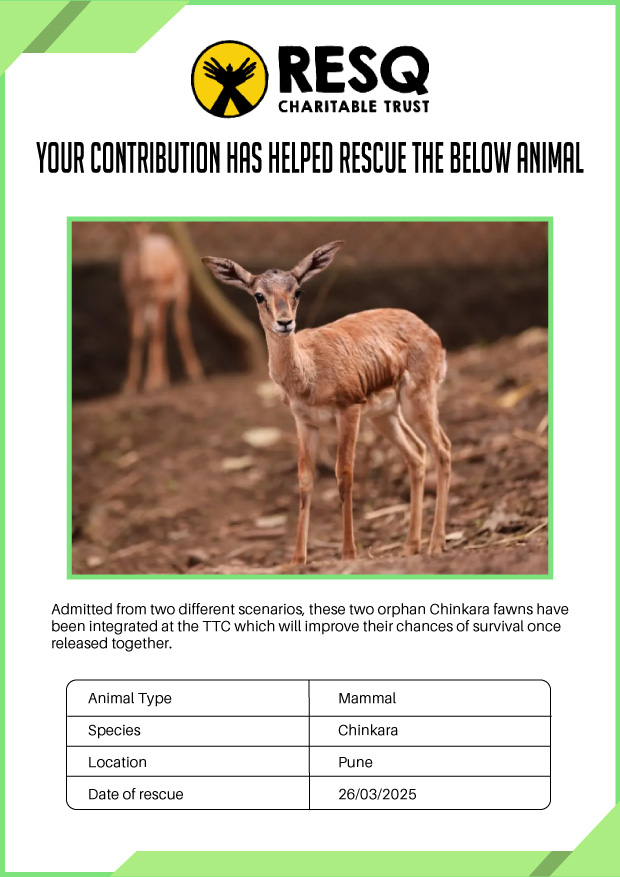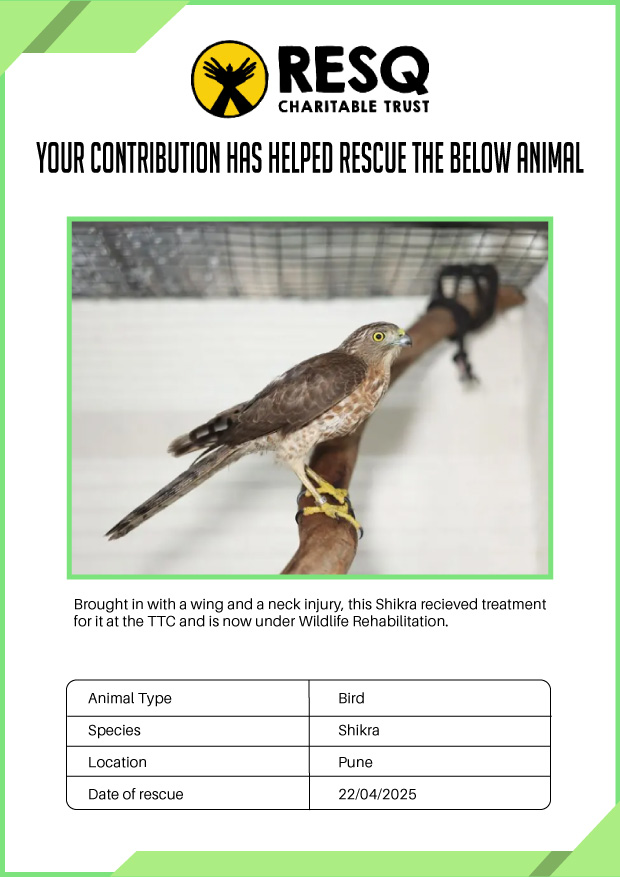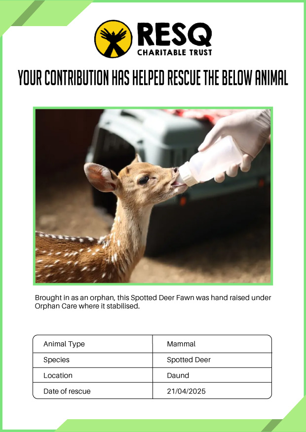 Maharashtra is home to a diverse population of wild animals, many of whom are key species identified to be globally declining. The Pune-based NGO - RESQ provides emergency aid to animals in distress. Thousands of wild animals come to RESQ annually who are either injured, sick, orphaned, or victims of wildlife trafficking and illegal captivity.