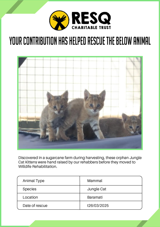 RESQ was founded in 2007 to provide emergency aid to animals in distress. Since then, the rescue and rehabilitation work of the organization has provided aid to thousands of animals of over 200+ species, improved public health and safety outcomes, and actively worked on preventing human-animal conflict across multiple urban and rural ecosystems.