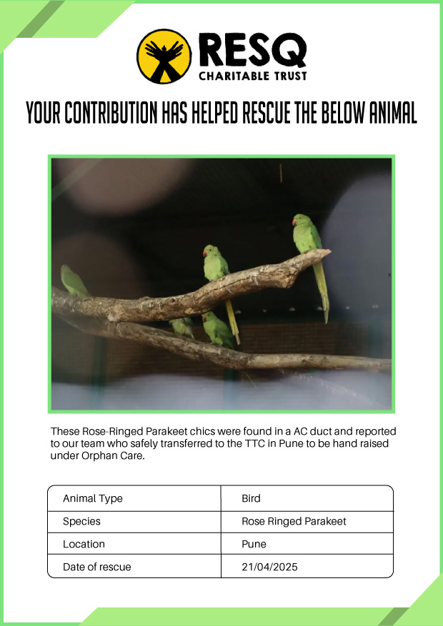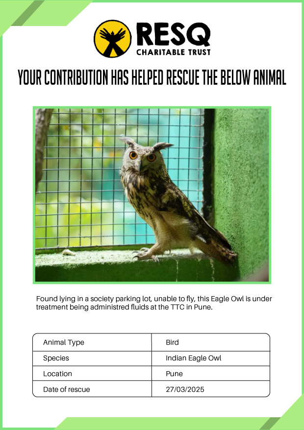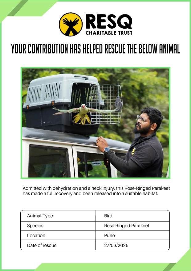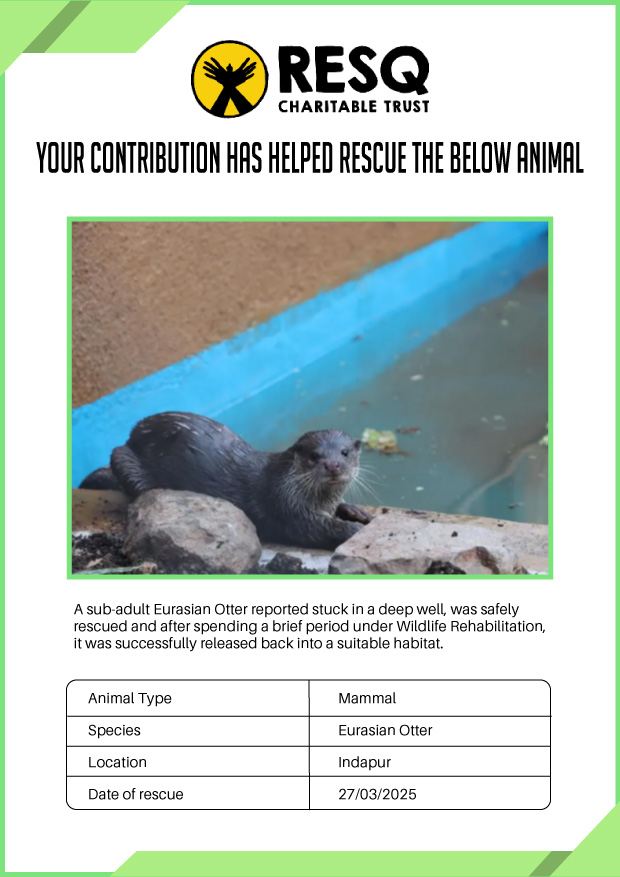 Maharashtra is home to a diverse population of wild animals, many of whom are key species identified to be globally declining. The Pune-based NGO - RESQ provides emergency aid to animals in distress. Thousands of wild animals come to RESQ annually who are either injured, sick, orphaned, or victims of wildlife trafficking and illegal captivity.