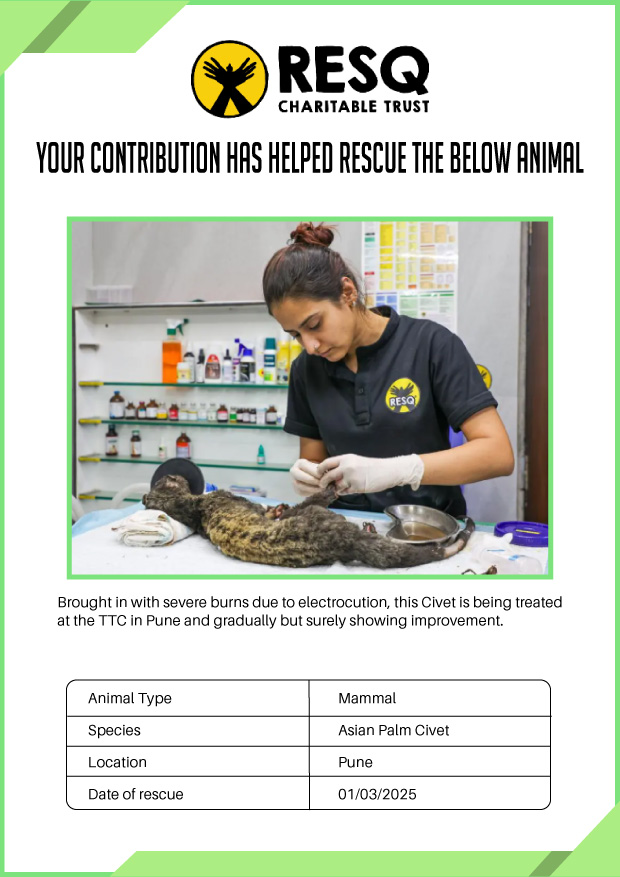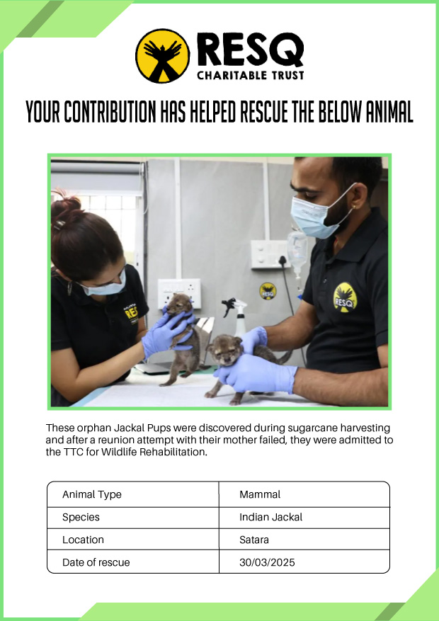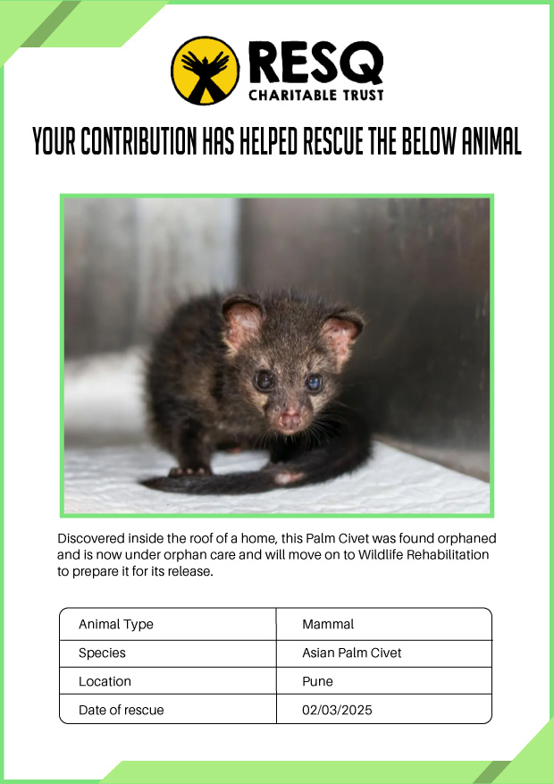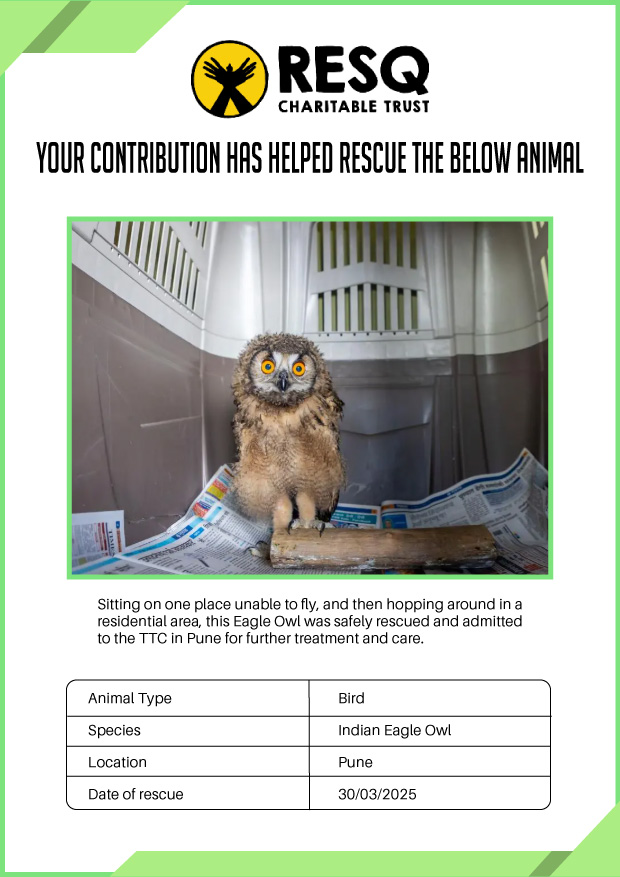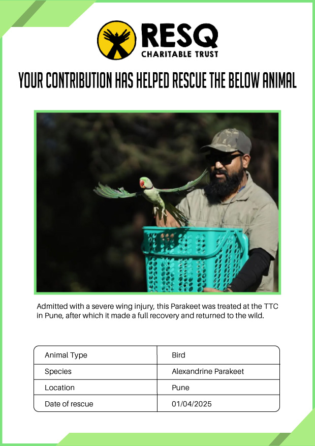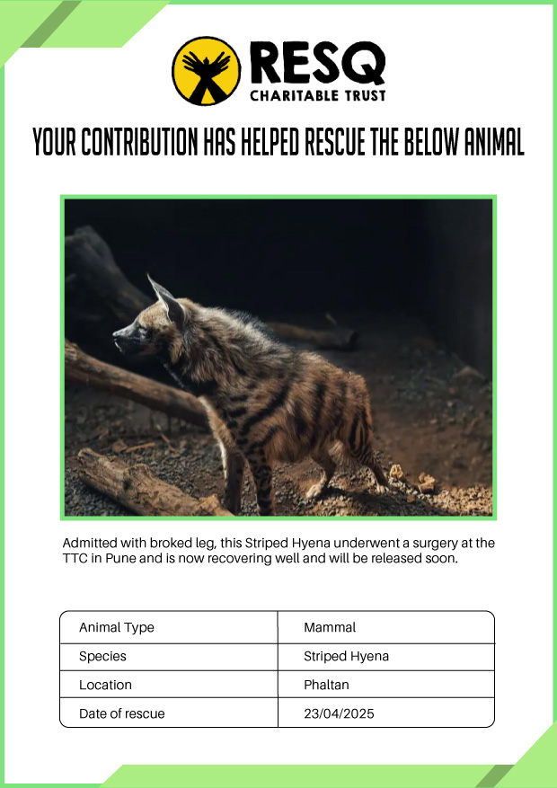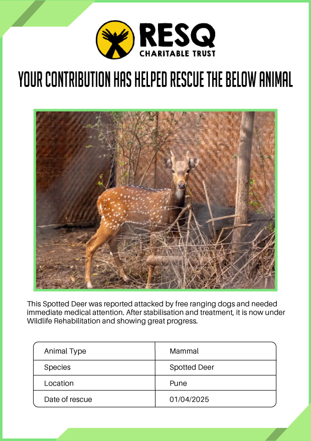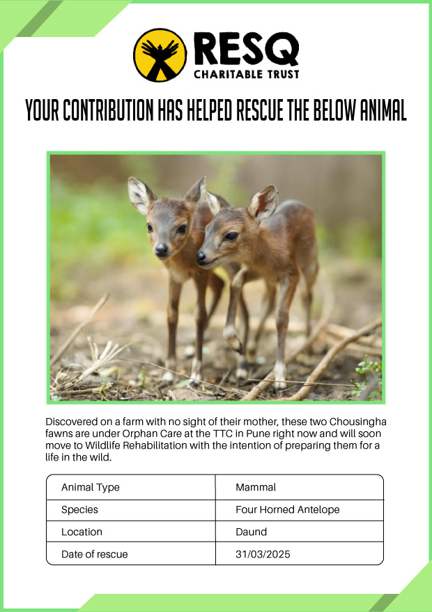 Maharashtra is home to a diverse population of wild animals, many of whom are key species identified to be globally declining. The Pune-based NGO - RESQ provides emergency aid to animals in distress. Thousands of wild animals come to RESQ annually who are either injured, sick, orphaned, or victims of wildlife trafficking and illegal captivity.