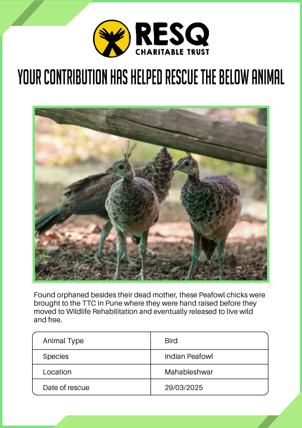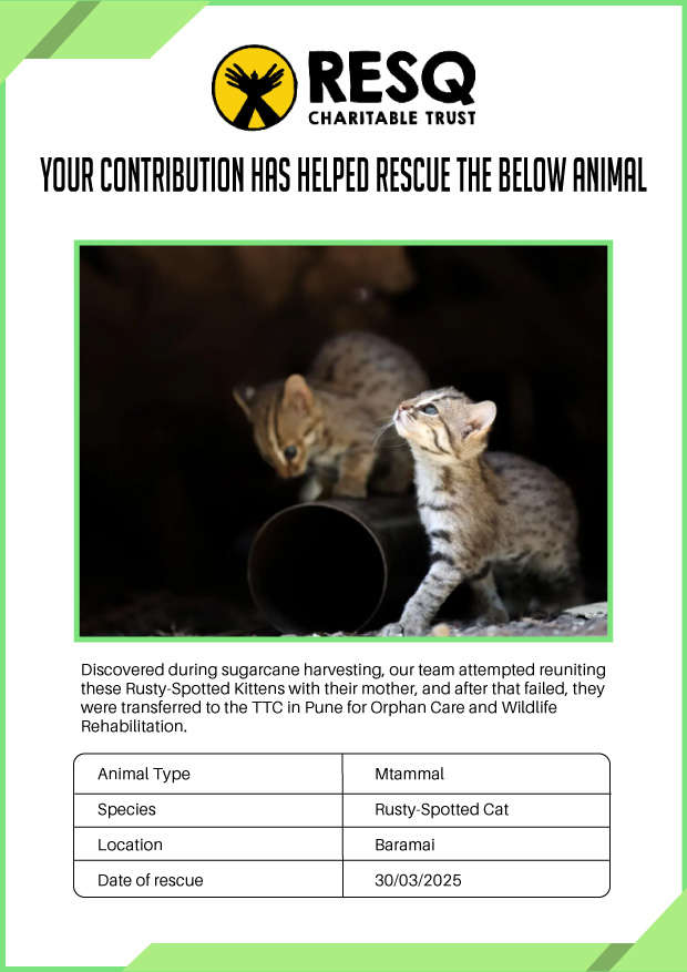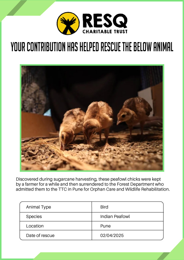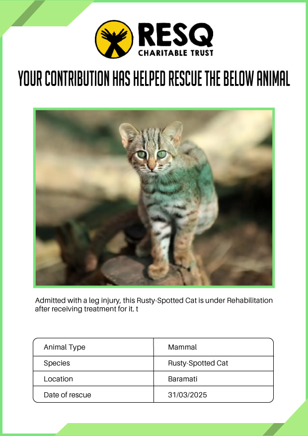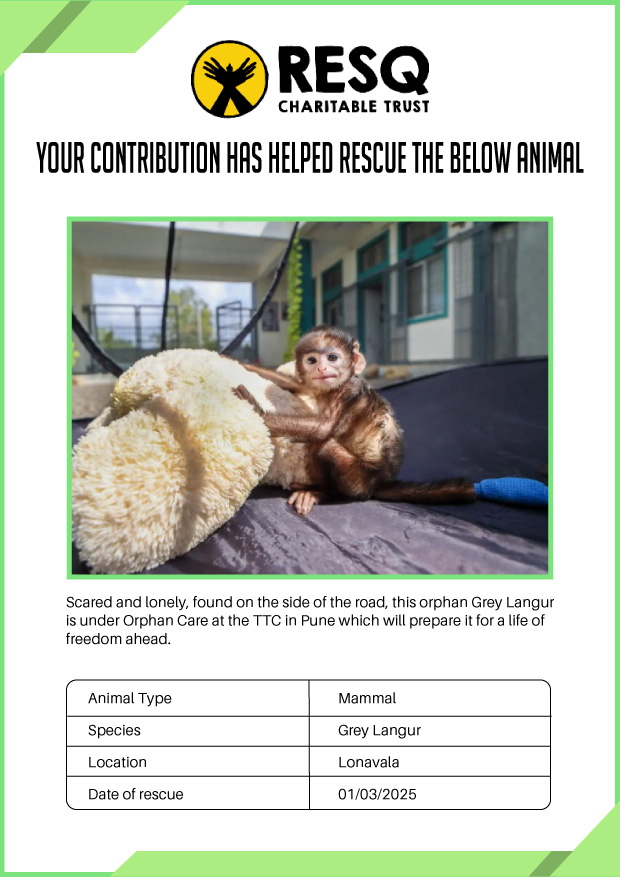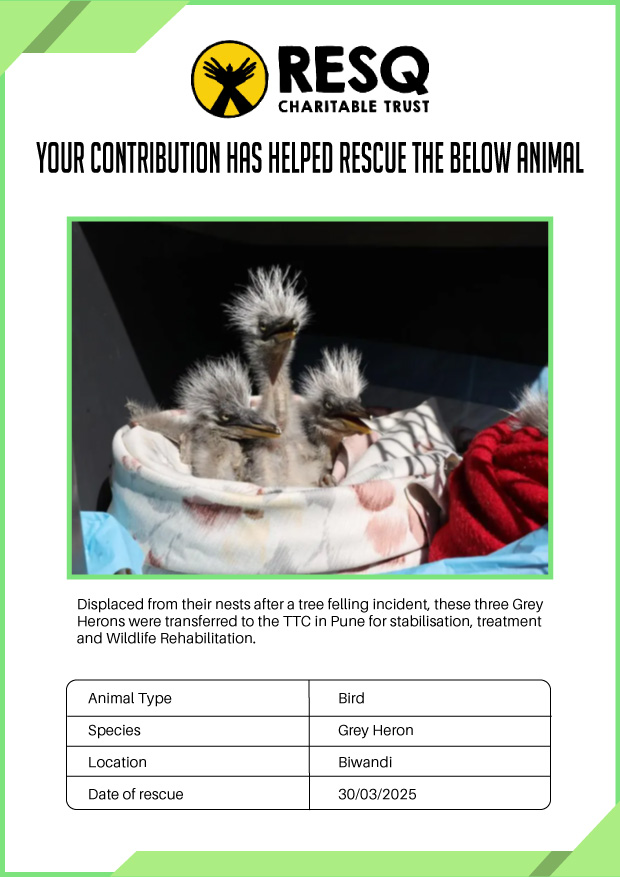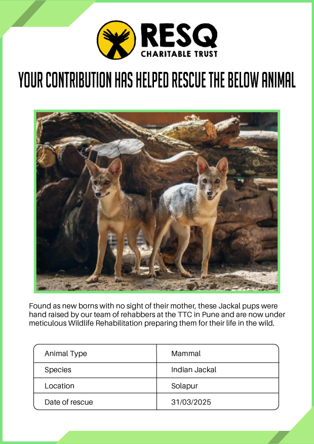 Maharashtra is home to a diverse population of wild animals, many of whom are key species identified to be globally declining. The Pune-based NGO - RESQ provides emergency aid to animals in distress. Thousands of wild animals come to RESQ annually who are either injured, sick, orphaned, or victims of wildlife trafficking and illegal captivity.