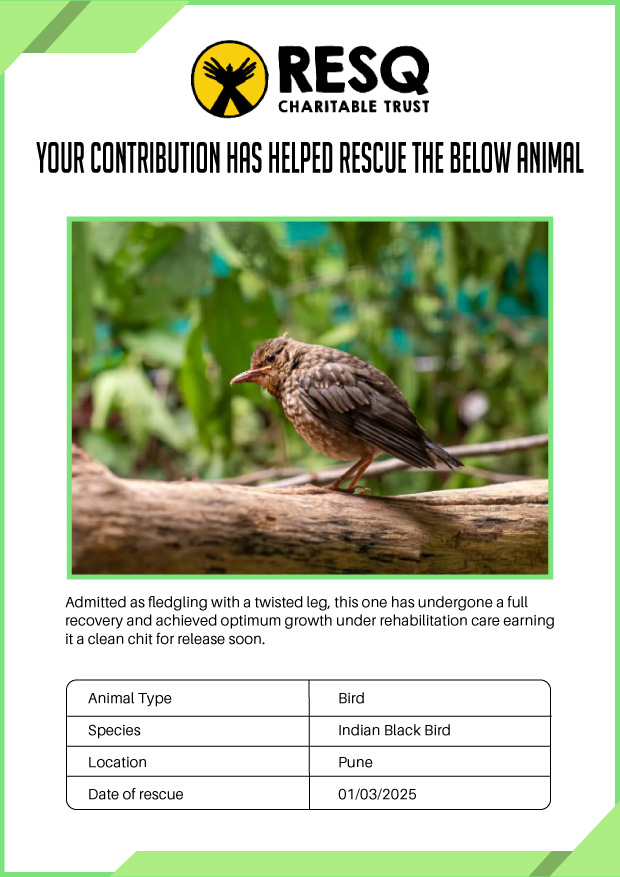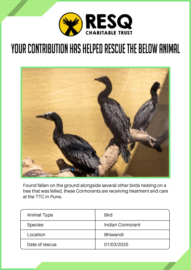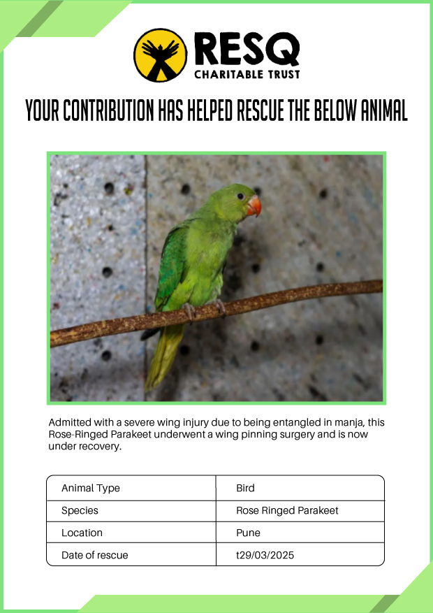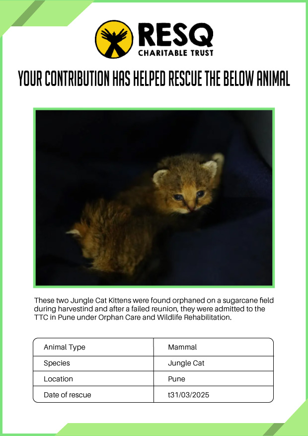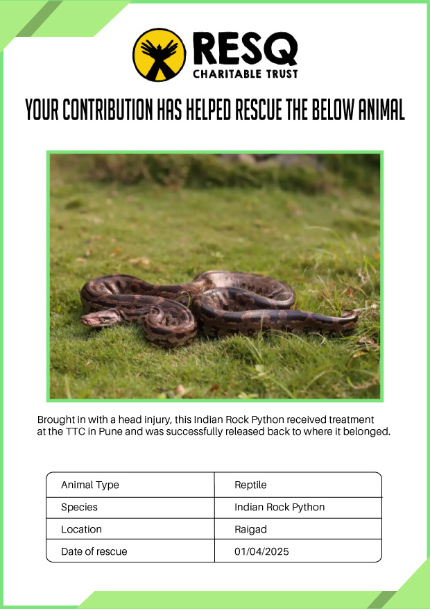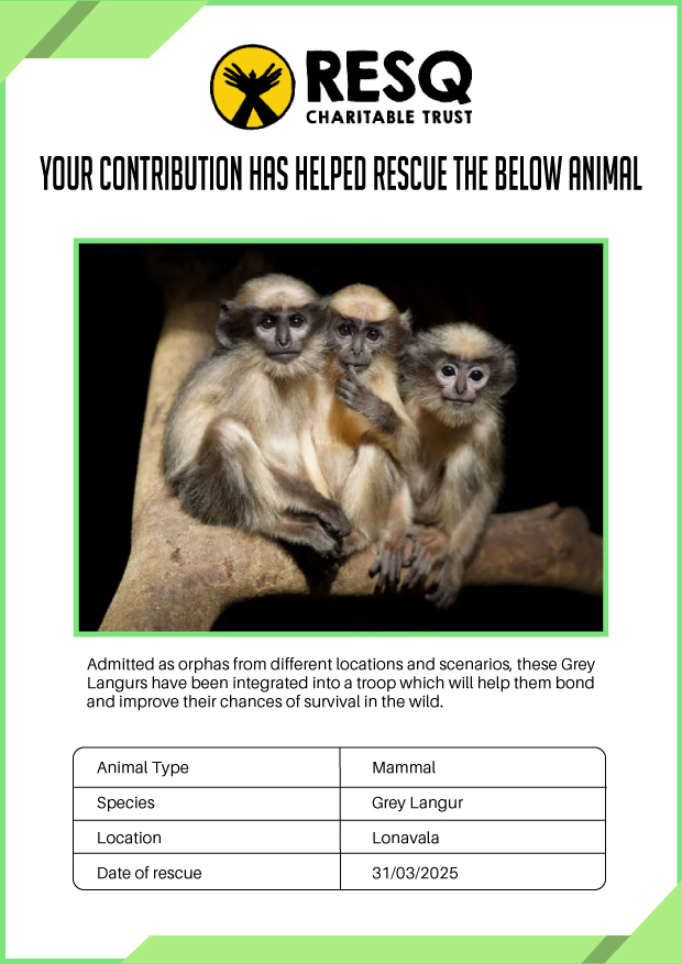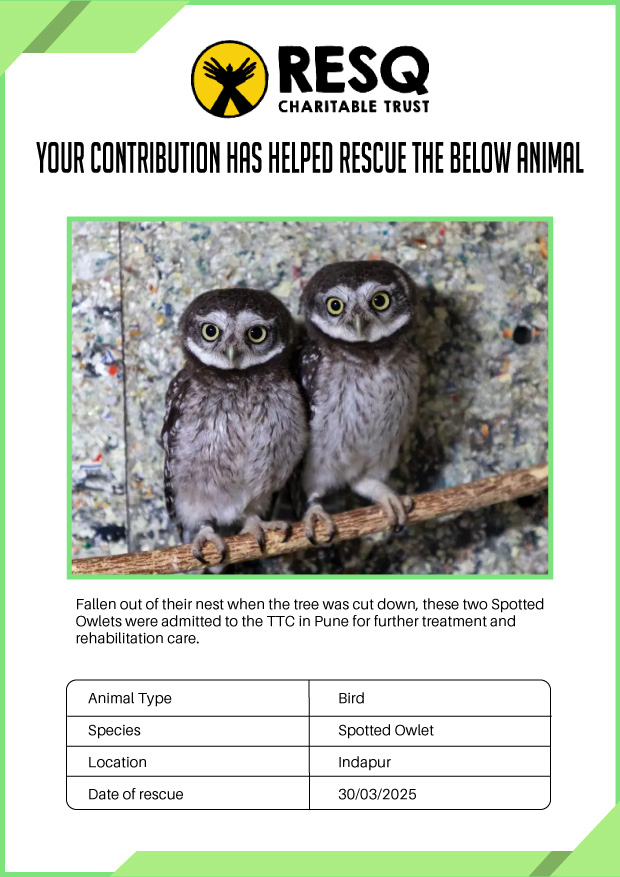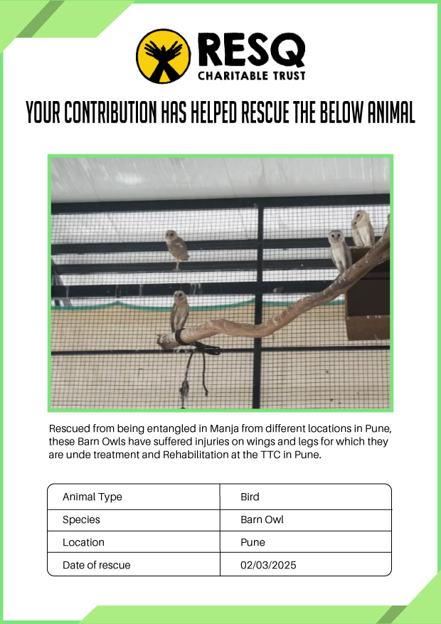 Maharashtra is home to a diverse population of wild animals, many of whom are key species identified to be globally declining. The Pune-based NGO - RESQ provides emergency aid to animals in distress. Thousands of wild animals come to RESQ annually who are either injured, sick, orphaned, or victims of wildlife trafficking and illegal captivity.