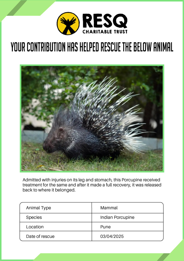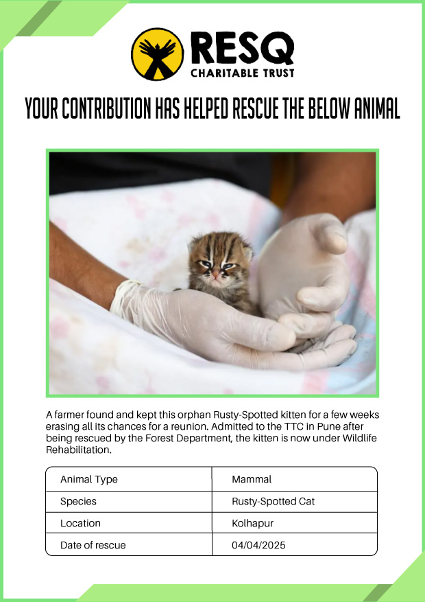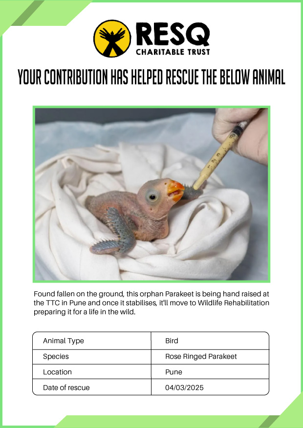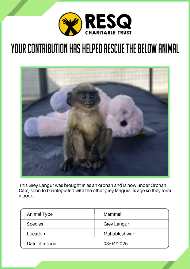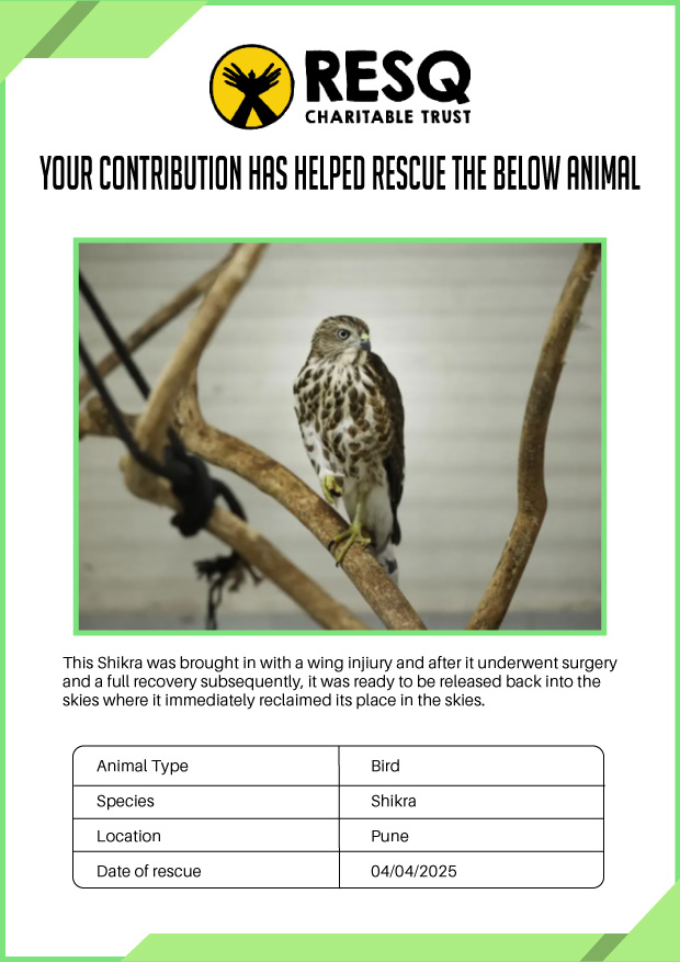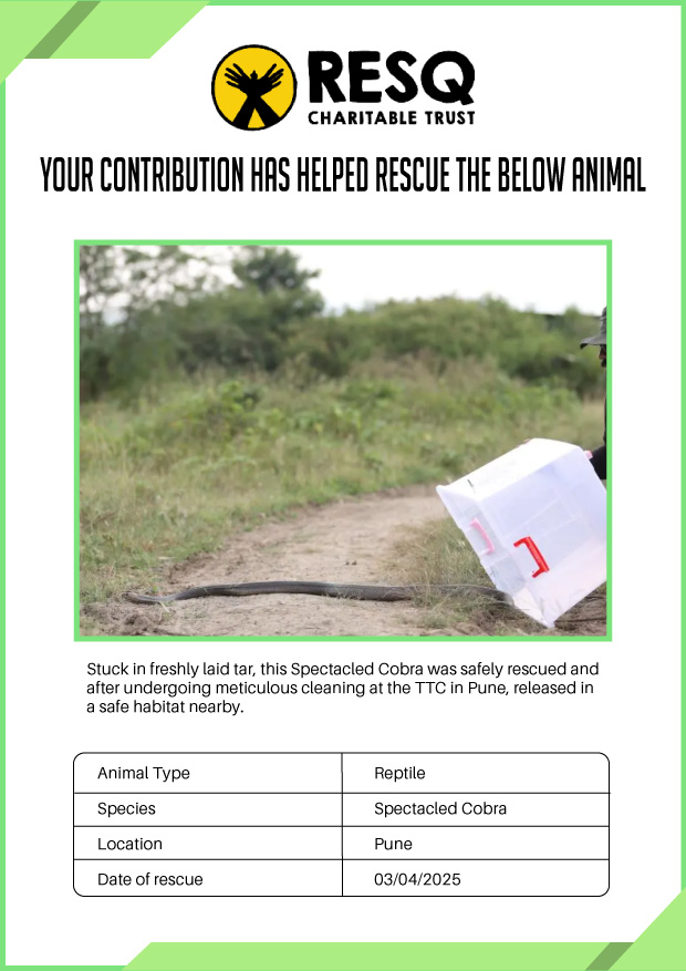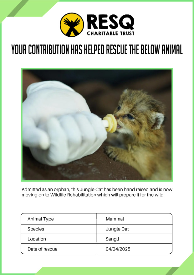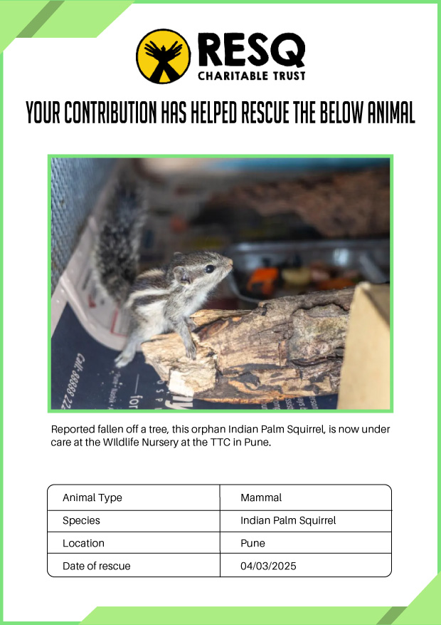 Maharashtra is home to a diverse population of wild animals, many of whom are key species identified to be globally declining. The Pune-based NGO - RESQ provides emergency aid to animals in distress. Thousands of wild animals come to RESQ annually who are either injured, sick, orphaned, or victims of wildlife trafficking and illegal captivity.