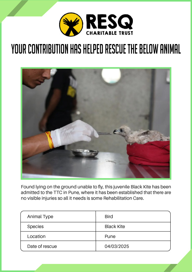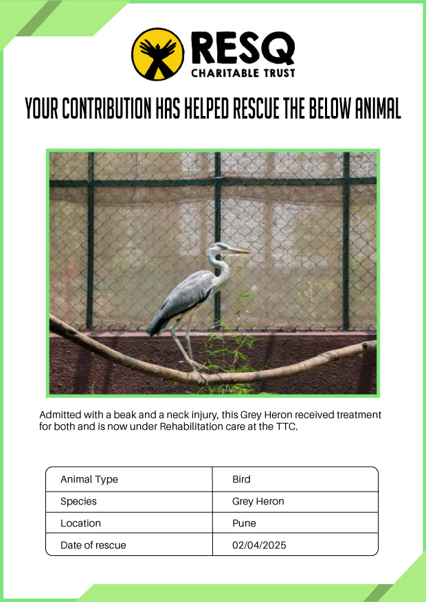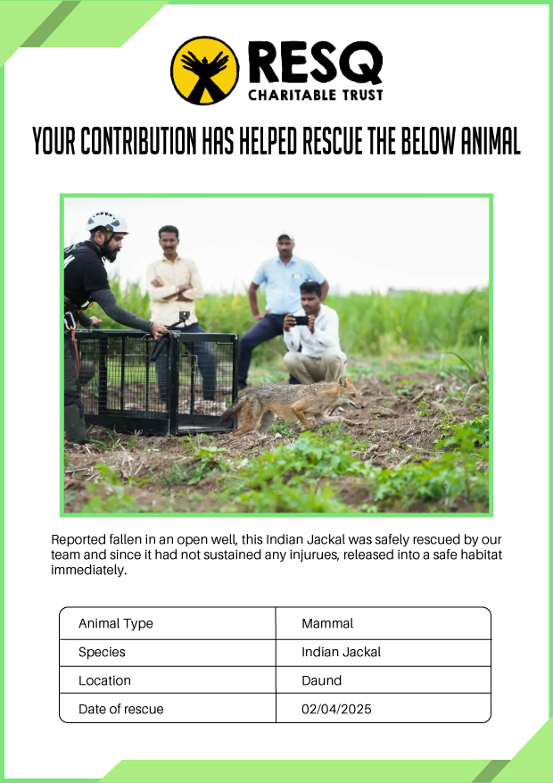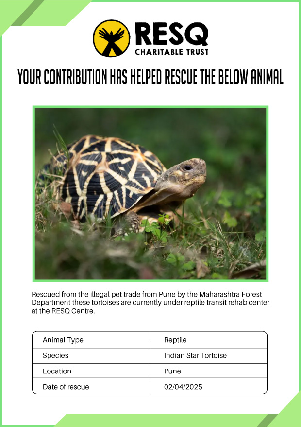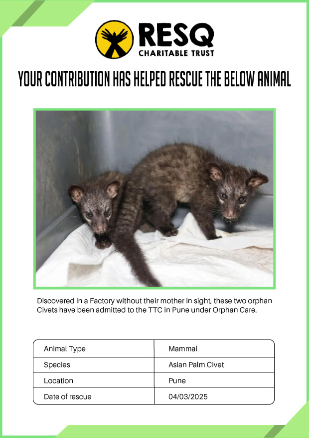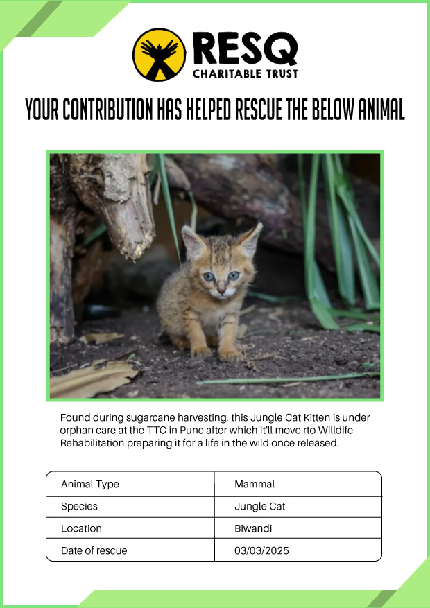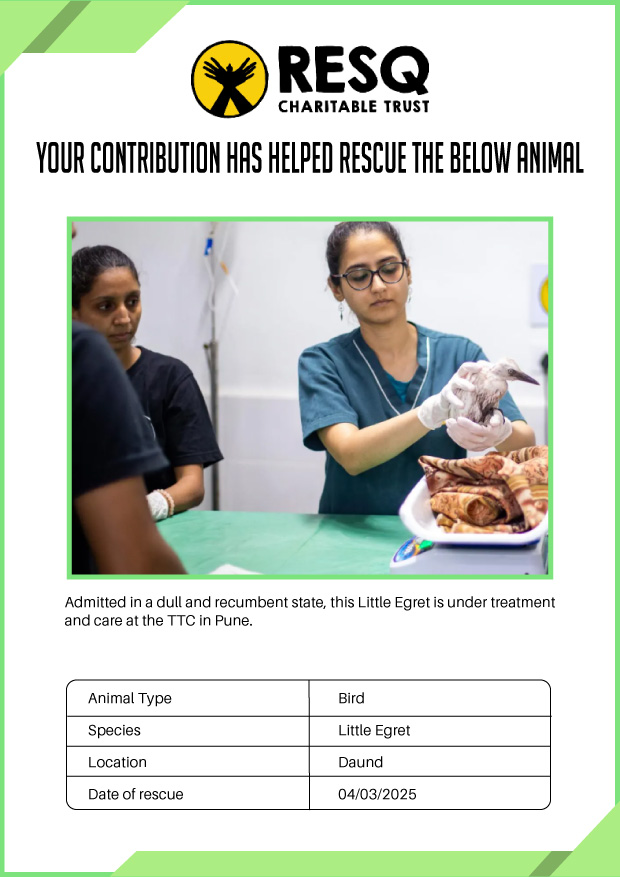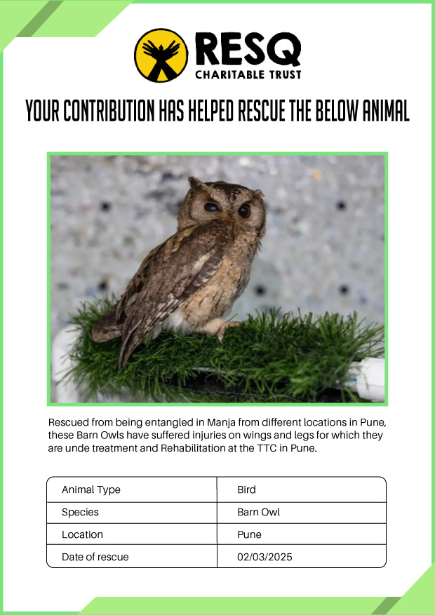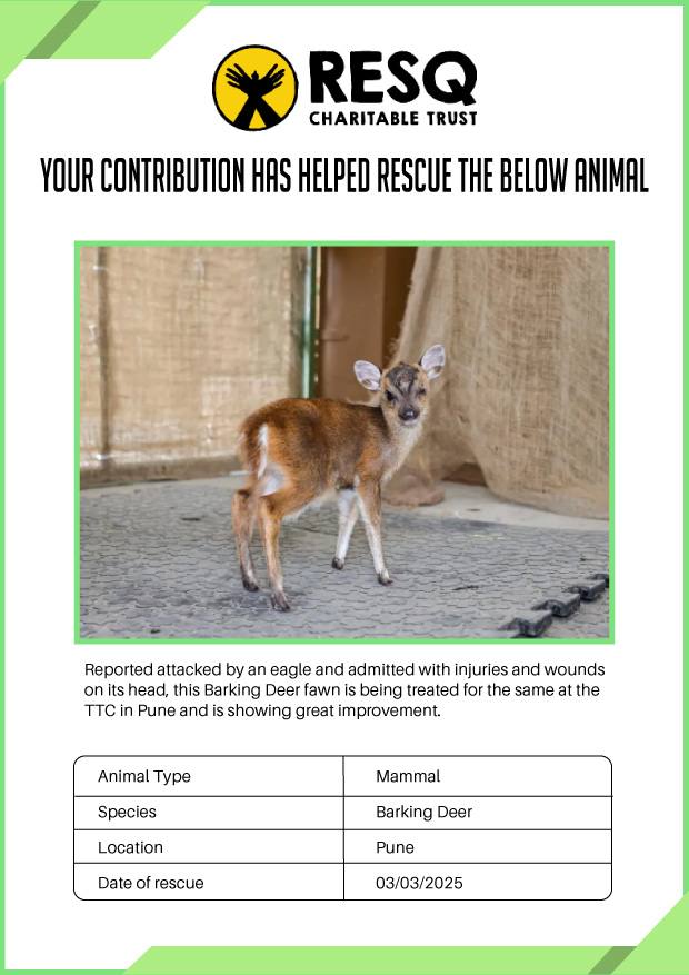 Maharashtra is home to a diverse population of wild animals, many of whom are key species identified to be globally declining. The Pune-based NGO - RESQ provides emergency aid to animals in distress. Thousands of wild animals come to RESQ annually who are either injured, sick, orphaned, or victims of wildlife trafficking and illegal captivity.