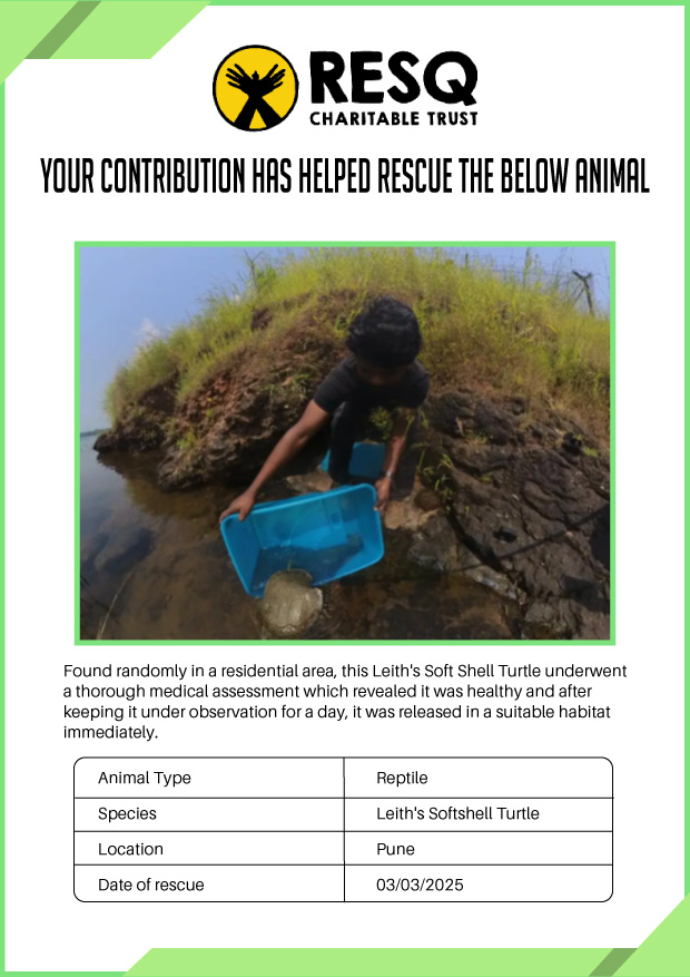 RESQ was founded in 2007 to provide emergency aid to animals in distress. Since then, the rescue and rehabilitation work of the organization has provided aid to thousands of animals of over 200+ species, improved public health and safety outcomes, and actively worked on preventing human-animal conflict across multiple urban and rural ecosystems.
