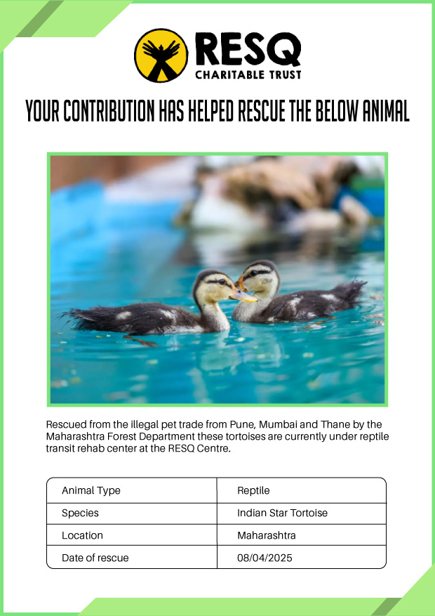 Maharashtra is home to a diverse population of wild animals, many of whom are key species identified to be globally declining. The Pune-based NGO - RESQ provides emergency aid to animals in distress. Thousands of wild animals come to RESQ annually who are either injured, sick, orphaned, or victims of wildlife trafficking and illegal captivity.