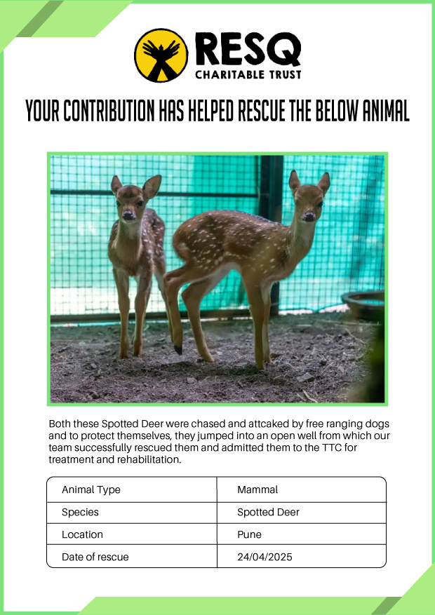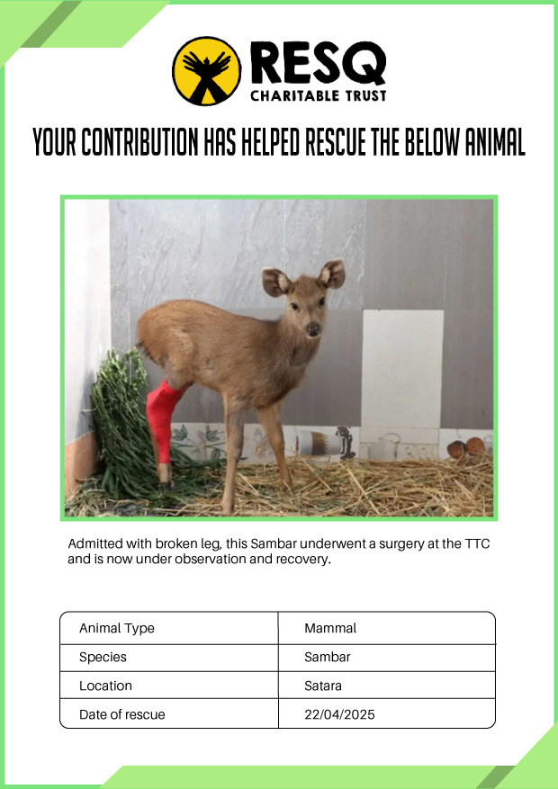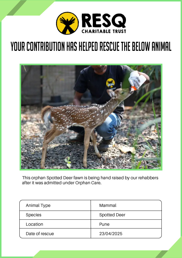 Maharashtra is home to a diverse population of wild animals, many of whom are key species identified to be globally declining. The Pune-based NGO - RESQ provides emergency aid to animals in distress. Thousands of wild animals come to RESQ annually who are either injured, sick, orphaned, or victims of wildlife trafficking and illegal captivity.