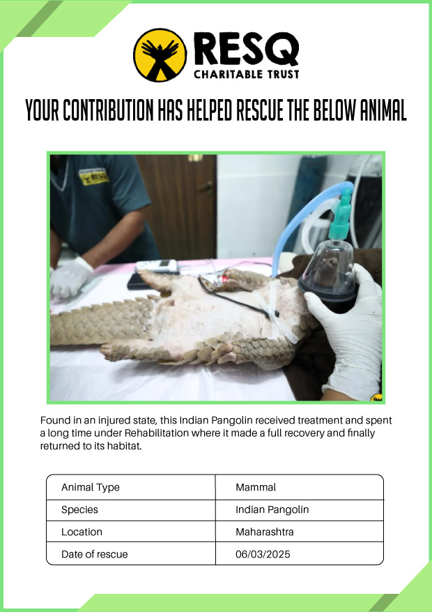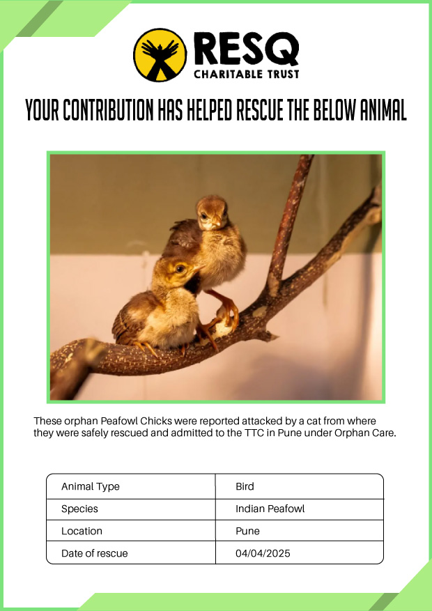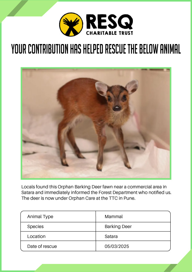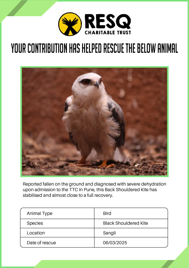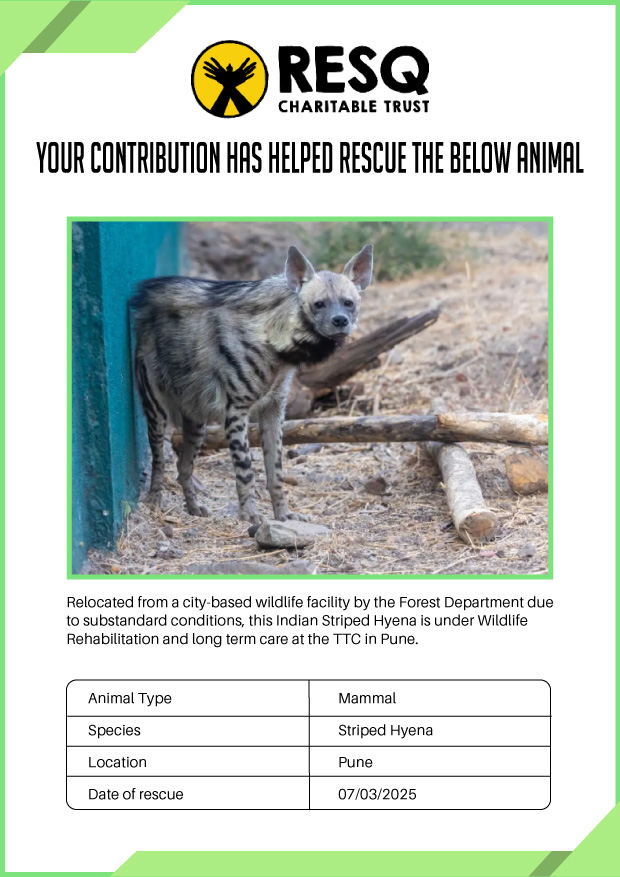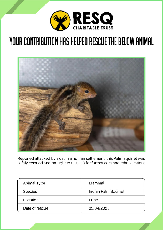 Maharashtra is home to a diverse population of wild animals, many of whom are key species identified to be globally declining. The Pune-based NGO - RESQ provides emergency aid to animals in distress. Thousands of wild animals come to RESQ annually who are either injured, sick, orphaned, or victims of wildlife trafficking and illegal captivity.