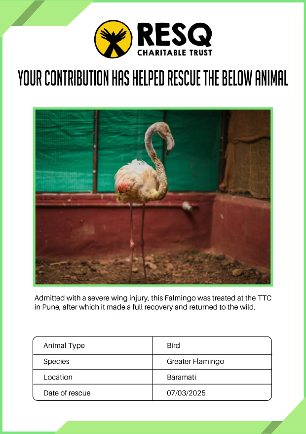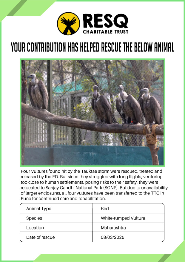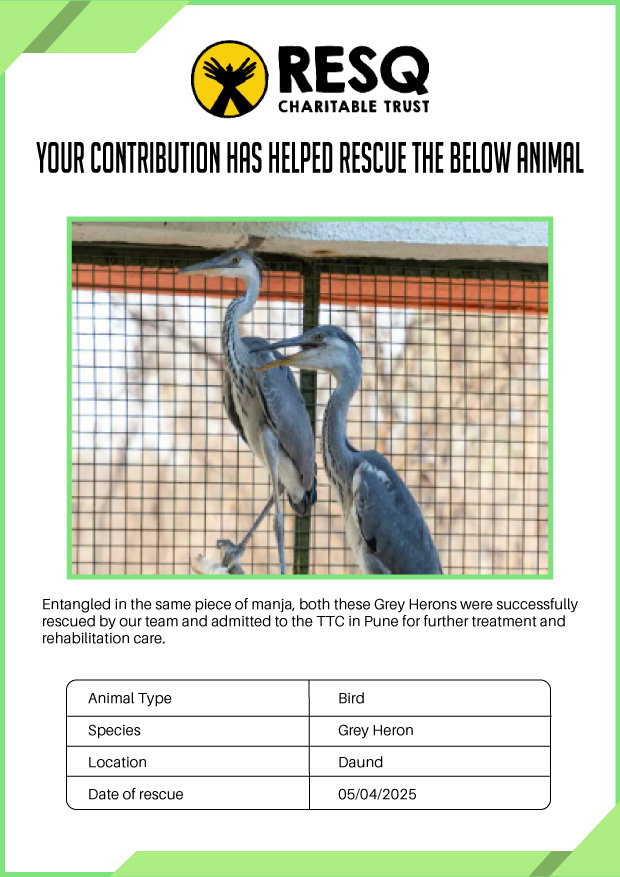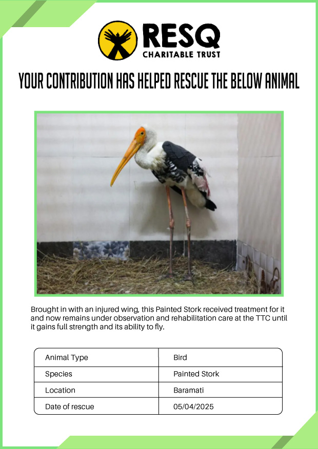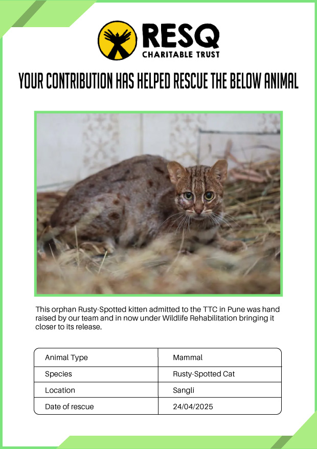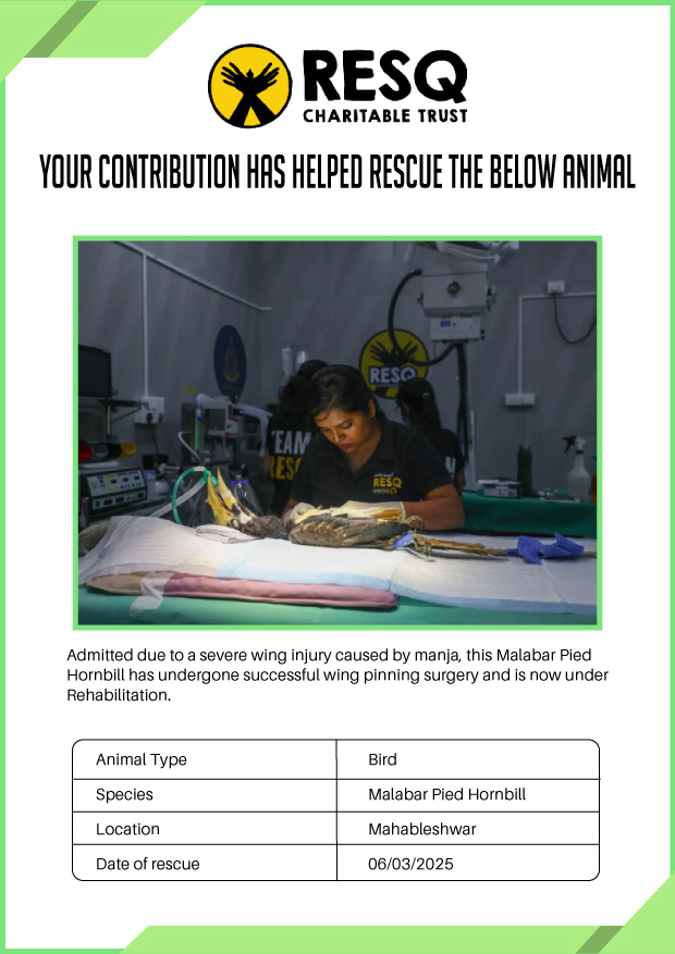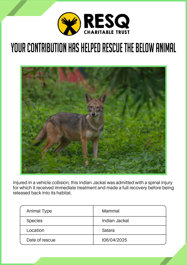 Maharashtra is home to a diverse population of wild animals, many of whom are key species identified to be globally declining. The Pune-based NGO - RESQ provides emergency aid to animals in distress. Thousands of wild animals come to RESQ annually who are either injured, sick, orphaned, or victims of wildlife trafficking and illegal captivity.