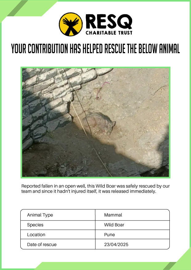 Maharashtra is home to a diverse population of wild animals, many of whom are key species identified to be globally declining. The Pune-based NGO - RESQ provides emergency aid to animals in distress. Thousands of wild animals come to RESQ annually who are either injured, sick, orphaned, or victims of wildlife trafficking and illegal captivity.