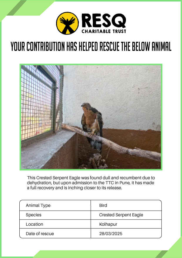 Maharashtra is home to a diverse population of wild animals, many of whom are key species identified to be globally declining. The Pune-based NGO - RESQ provides emergency aid to animals in distress. Thousands of wild animals come to RESQ annually who are either injured, sick, orphaned, or victims of wildlife trafficking and illegal captivity.