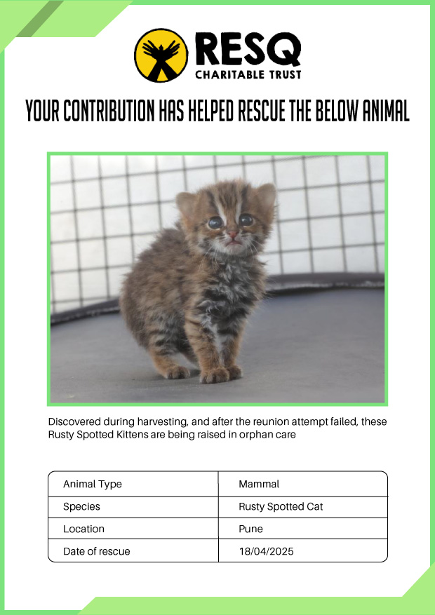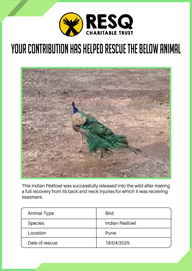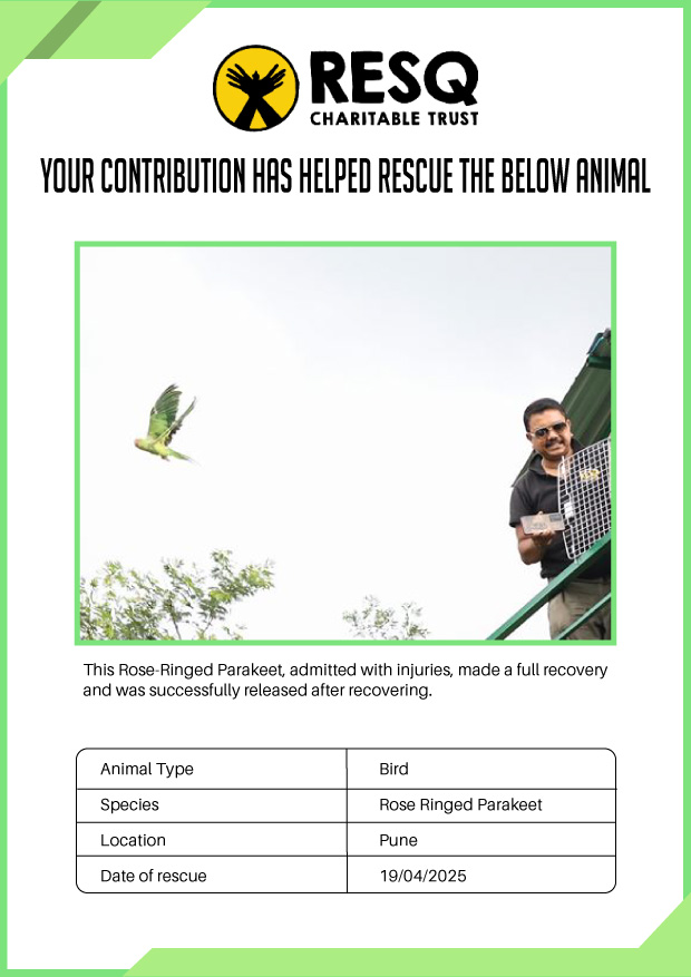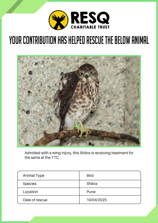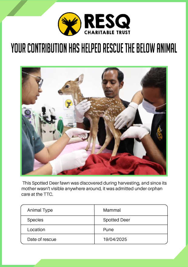 Maharashtra is home to a diverse population of wild animals, many of whom are key species identified to be globally declining. The Pune-based NGO - RESQ provides emergency aid to animals in distress. Thousands of wild animals come to RESQ annually who are either injured, sick, orphaned, or victims of wildlife trafficking and illegal captivity.