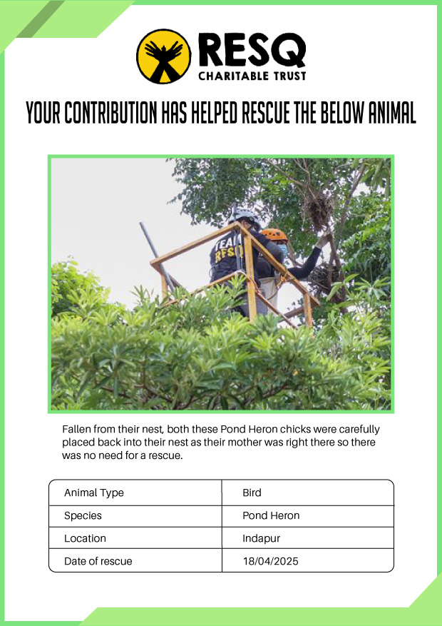 RESQ was founded in 2007 to provide emergency aid to animals in distress. Since then, the rescue and rehabilitation work of the organization has provided aid to thousands of animals of over 200+ species, improved public health and safety outcomes, and actively worked on preventing human-animal conflict across multiple urban and rural ecosystems.