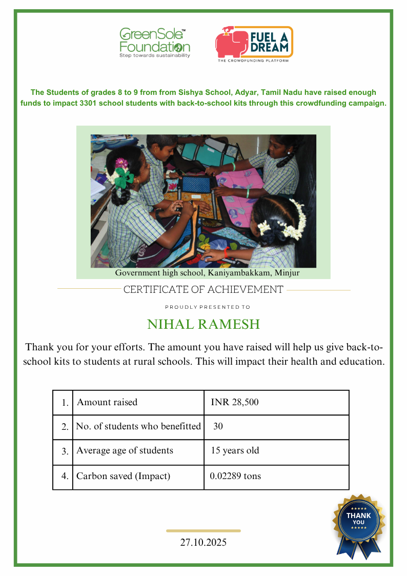 I have undertaken this campaign because I was surprised to learn that many students from low-income homes in Tamil Nadu, who go to school (mainly govt schools) do not have basic school gear like proper footwear or a school bag and often sit on the hard ground in order to study at school.