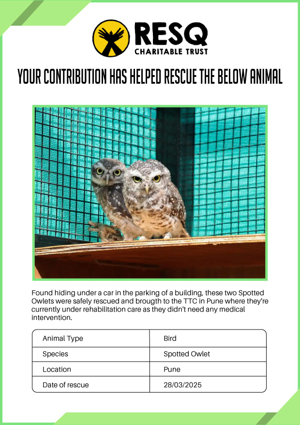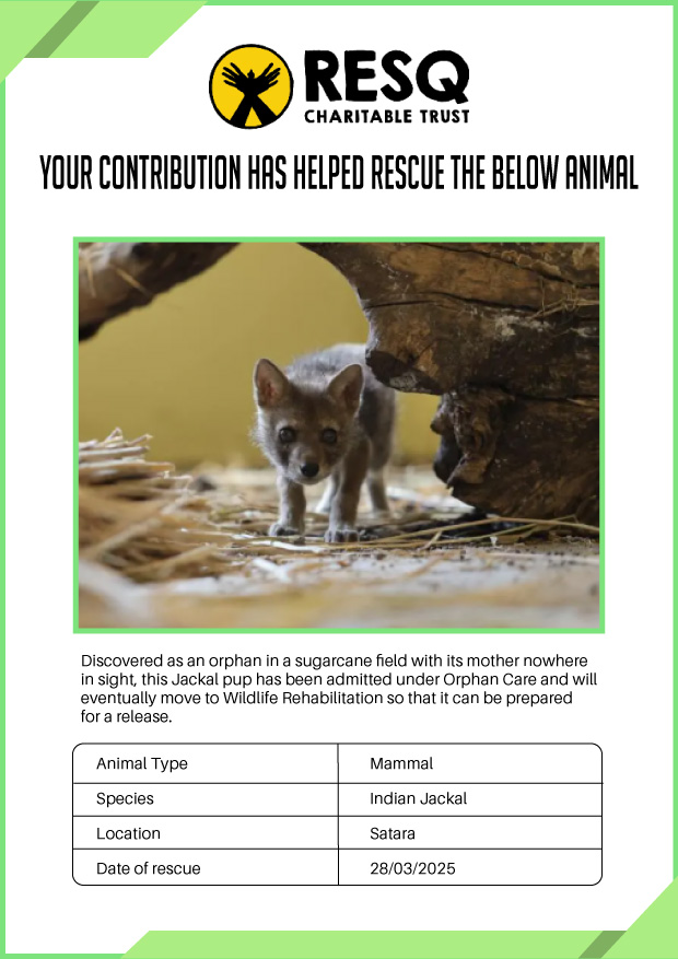 Maharashtra is home to a diverse population of wild animals, many of whom are key species identified to be globally declining. The Pune-based NGO - RESQ provides emergency aid to animals in distress. Thousands of wild animals come to RESQ annually who are either injured, sick, orphaned, or victims of wildlife trafficking and illegal captivity.