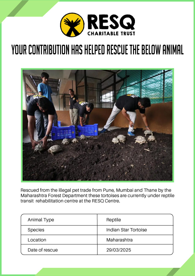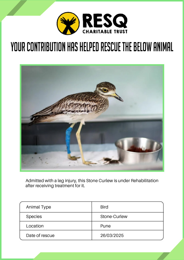 Maharashtra is home to a diverse population of wild animals, many of whom are key species identified to be globally declining. The Pune-based NGO - RESQ provides emergency aid to animals in distress. Thousands of wild animals come to RESQ annually who are either injured, sick, orphaned, or victims of wildlife trafficking and illegal captivity.