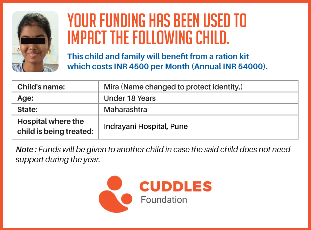 This campaign of mine is being done in partnership with the NGO -Cuddles Foundation and aims to fight hunger and malnutrition in children from low-income homes by giving them a MONTHLY RATION BASKET. This improves their chance of survival by 70% and ultimately does save lives. The baskets are given to children at the Bharti Vidyapeeth Hospital, Deenanath Mangeshkar Hospital, and Indrayani Cancer hospital in Pune.