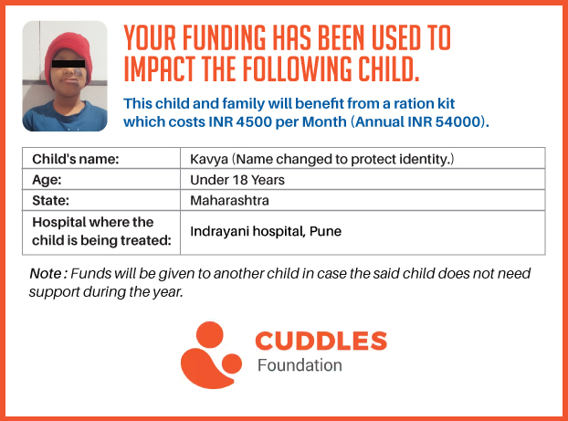 This campaign of mine is being done in partnership with the NGO -Cuddles Foundation and aims to fight hunger and malnutrition in children from low-income homes by giving them a MONTHLY RATION BASKET. This improves their chance of survival by 70% and ultimately does save lives. The baskets are given to children at the Bharti Vidyapeeth Hospital, Deenanath Mangeshkar Hospital, and Indrayani Cancer hospital in Pune.