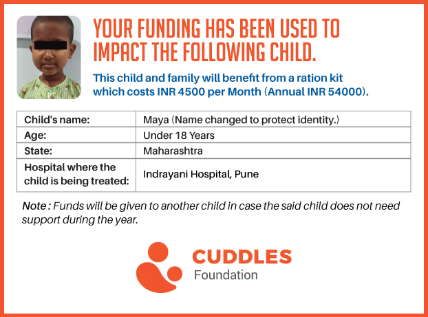 This campaign of mine is being done in partnership with the NGO -Cuddles Foundation and aims to fight hunger and malnutrition in children from low-income homes by giving them a MONTHLY RATION BASKET. This improves their chance of survival by 70% and ultimately does save lives. The baskets are given to children at the Bharti Vidyapeeth Hospital, Deenanath Mangeshkar Hospital, and Indrayani Cancer hospital in Pune.