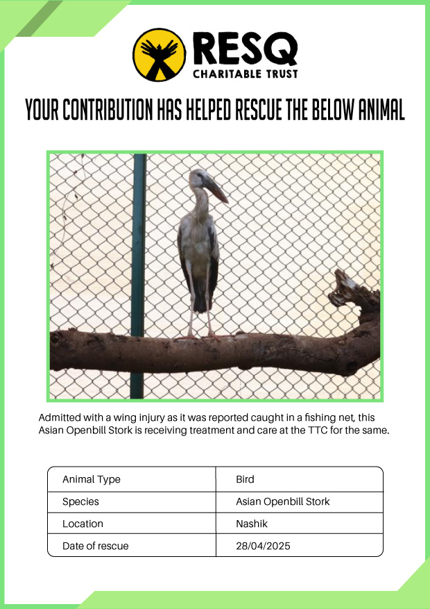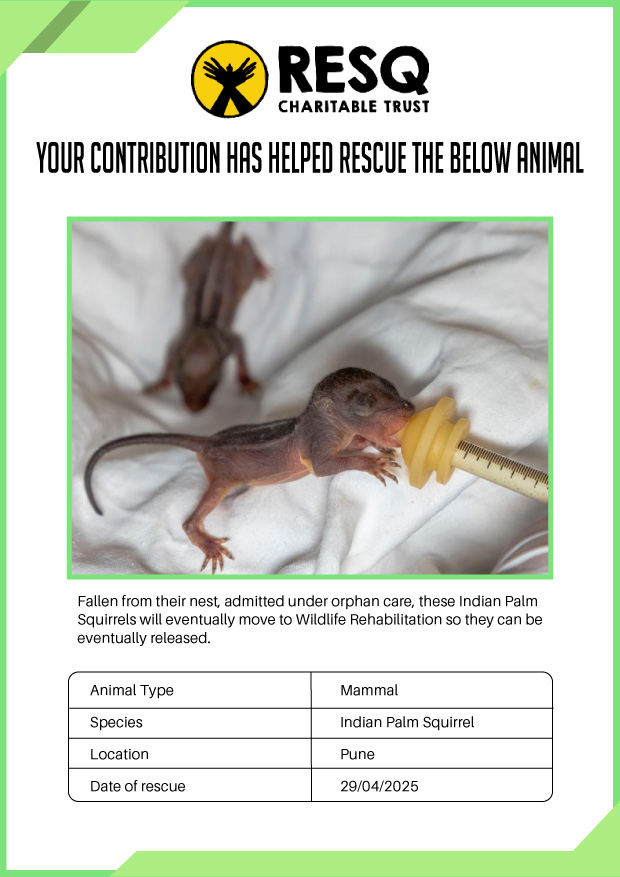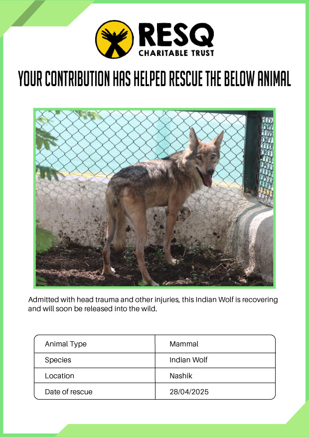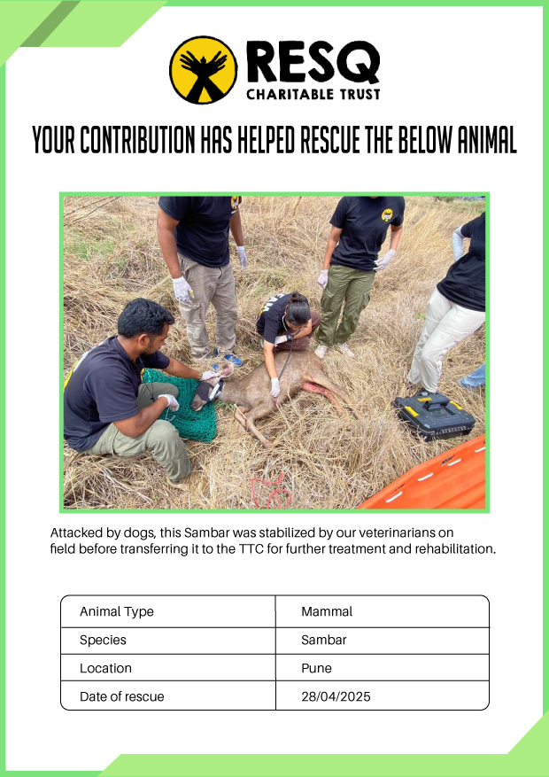 Maharashtra is home to a diverse population of wild animals, many of whom are key species identified to be globally declining. The Pune-based NGO - RESQ provides emergency aid to animals in distress. Thousands of wild animals come to RESQ annually who are either injured, sick, orphaned, or victims of wildlife trafficking and illegal captivity.