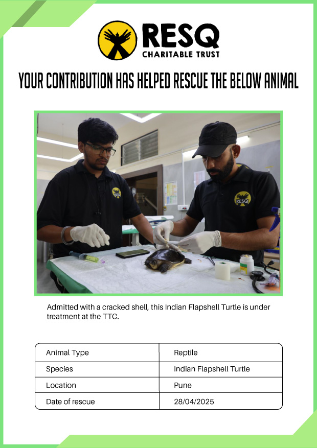 RESQ was founded in 2007 to provide emergency aid to animals in distress. Since then, the rescue and rehabilitation work of the organization has provided aid to thousands of animals of over 200+ species, improved public health and safety outcomes, and actively worked on preventing human-animal conflict across multiple urban and rural ecosystems.