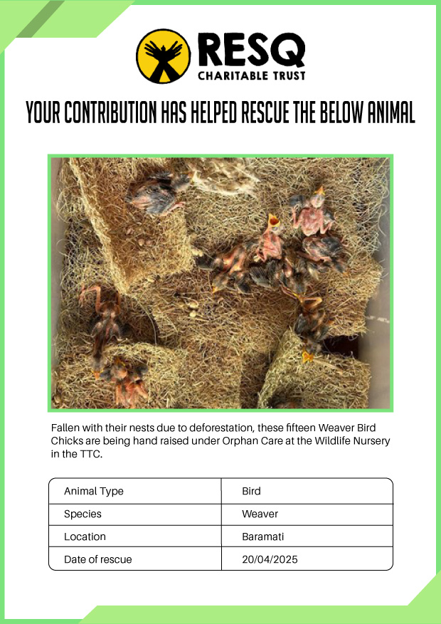 RESQ was founded in 2007 to provide emergency aid to animals in distress. Since then, the rescue and rehabilitation work of the organization has provided aid to thousands of animals of over 200+ species, improved public health and safety outcomes, and actively worked on preventing human-animal conflict across multiple urban and rural ecosystems.