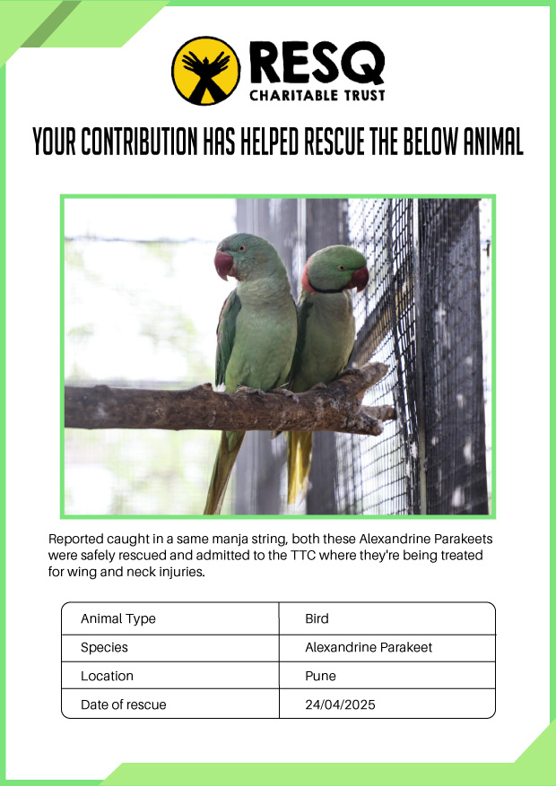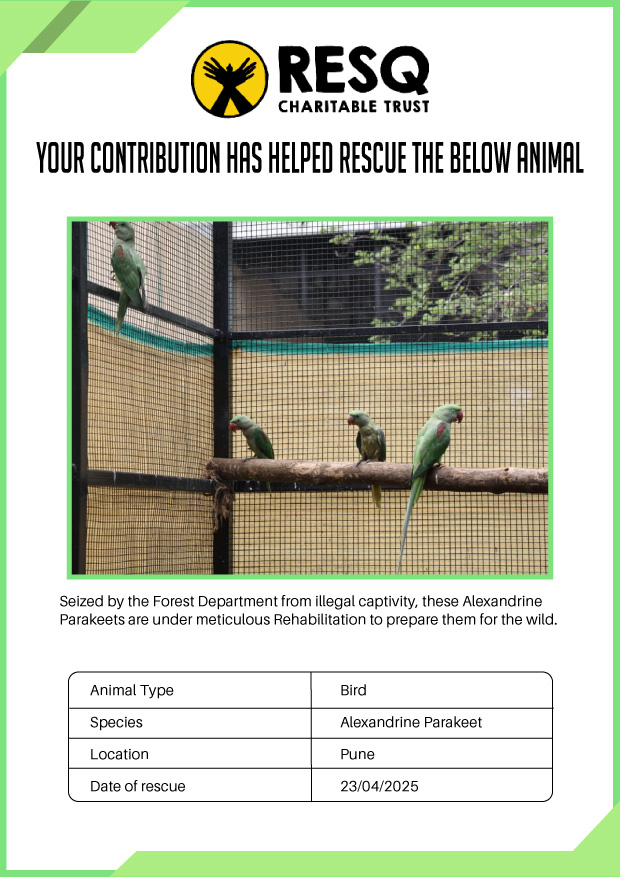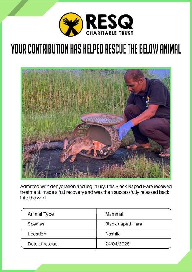 Maharashtra is home to a diverse population of wild animals, many of whom are key species identified to be globally declining. The Pune-based NGO - RESQ provides emergency aid to animals in distress. Thousands of wild animals come to RESQ annually who are either injured, sick, orphaned, or victims of wildlife trafficking and illegal captivity.