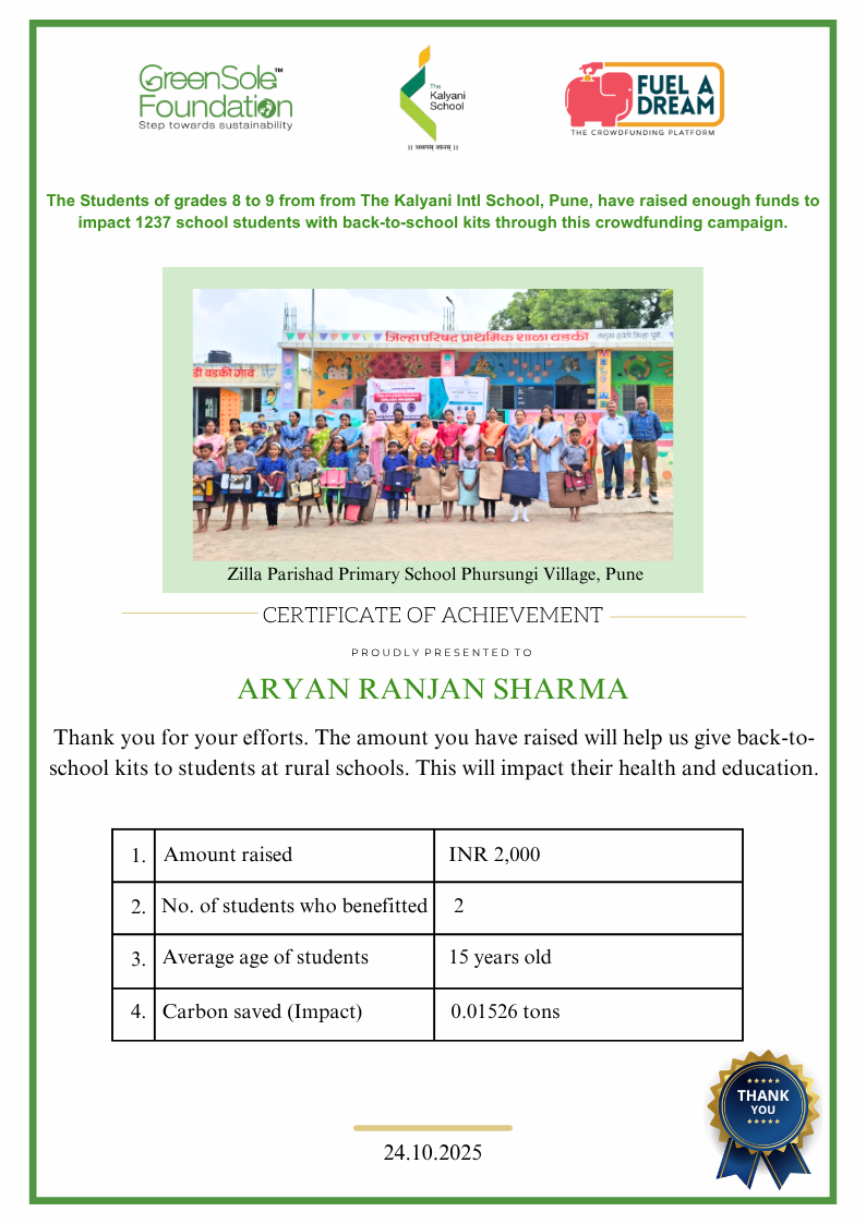 My name is ARYAN RANJAN SHARMA. I am 14 years old and a Grade 9 student at The Kalyani School, Pune.