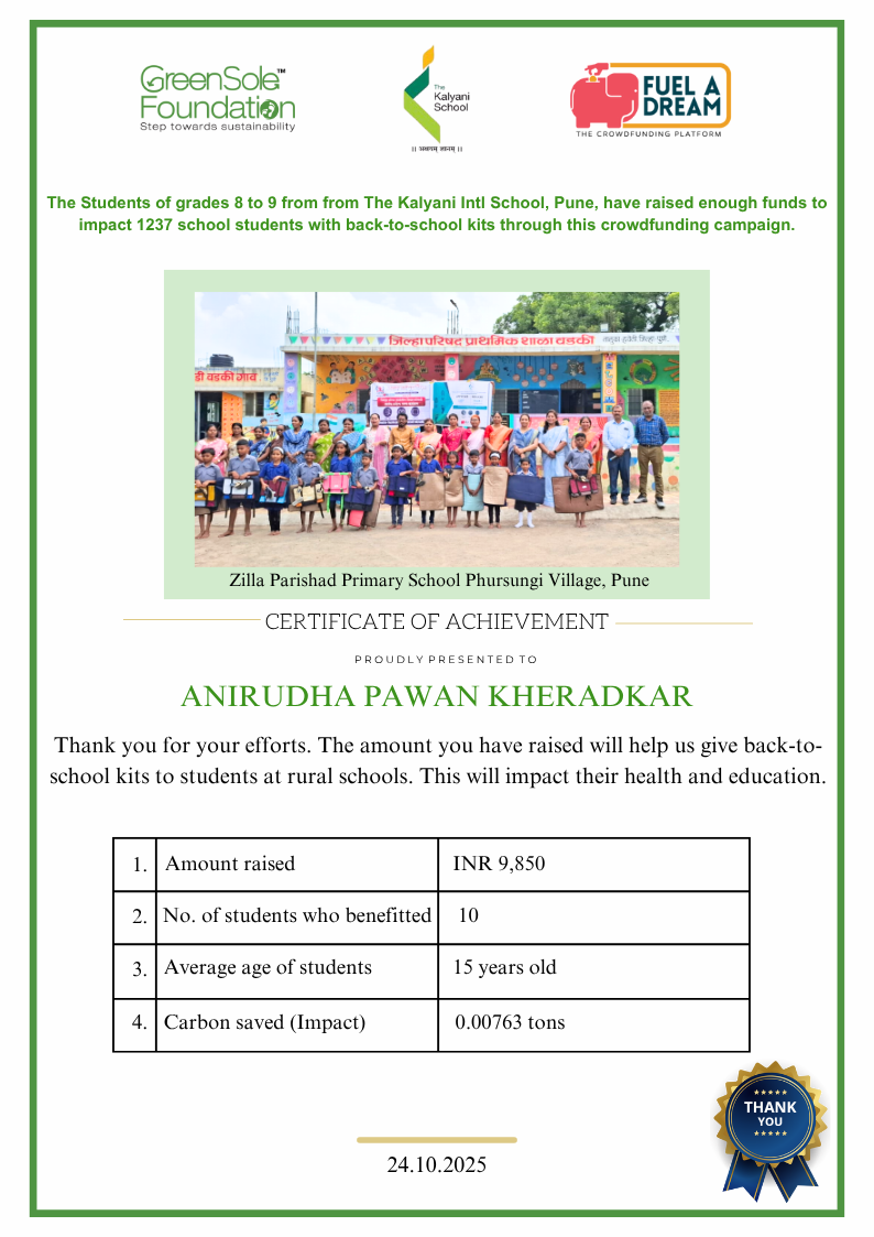 My name is ANIRUDHA PAWAN KHERADKAR. I am 13 years old and a Grade 9 student at The Kalyani School, Pune.