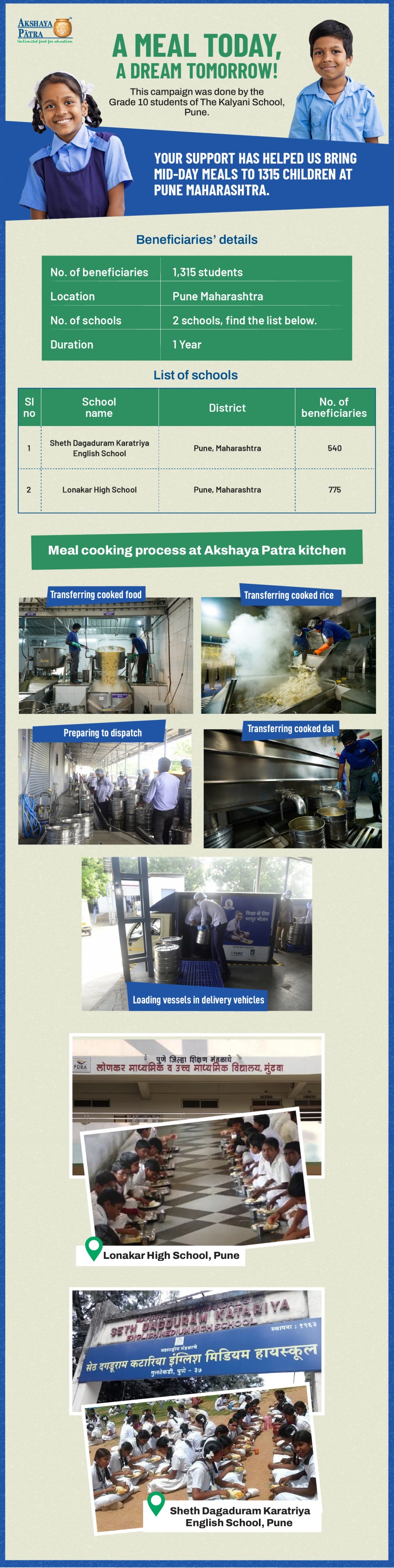 To ensure that there is complete transparency, I shall get a report from the NGO (this takes between 2 to 4 months, usually after the funds are raised and transferred to them) telling me who benefited from the funding. The details will then be posted from Akshaya Patra in the UPDATES section of my campaign. As soon as I post an update, the platform will send an EMAIL alert to all the funders - i.e., to you. Click on the link in the email and you can read about who benefited. That's transparent, right?
