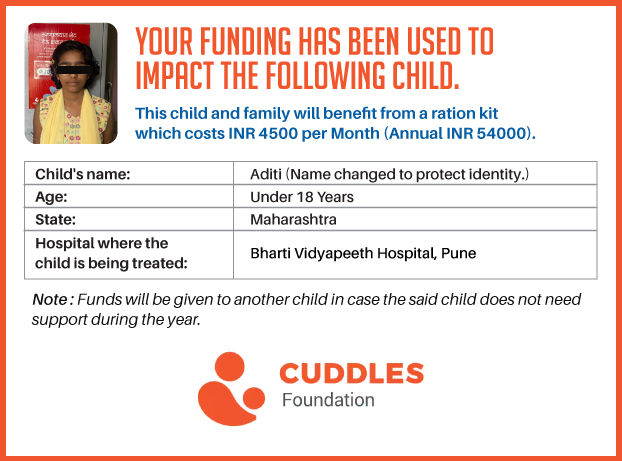 This campaign of mine is being done in partnership with the NGO -Cuddles Foundation and aims to fight hunger and malnutrition in children from low-income homes by giving them a MONTHLY RATION BASKET. This improves their chance of survival by 70% and ultimately does save lives. The baskets are given to children at the Bharti Vidyapeeth Hospital, Deenanath Mangeshkar Hospital, and Indrayani Cancer hospital in Pune.