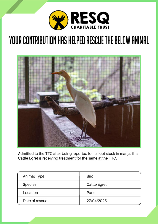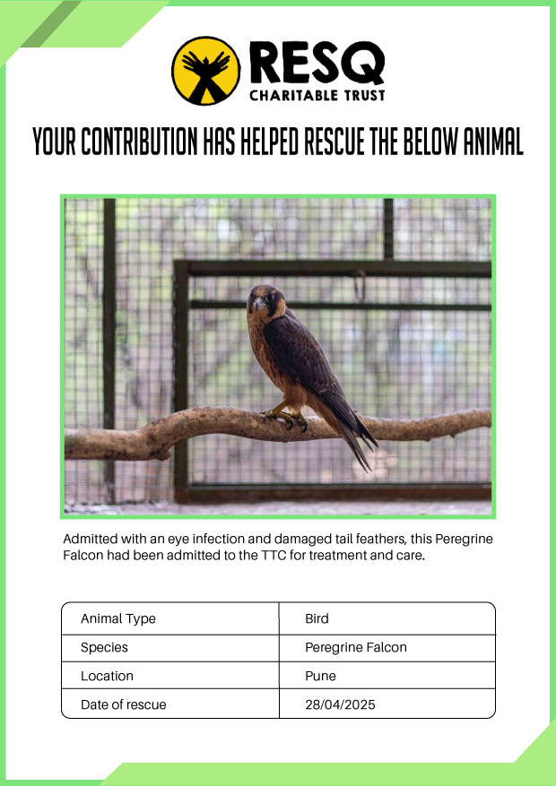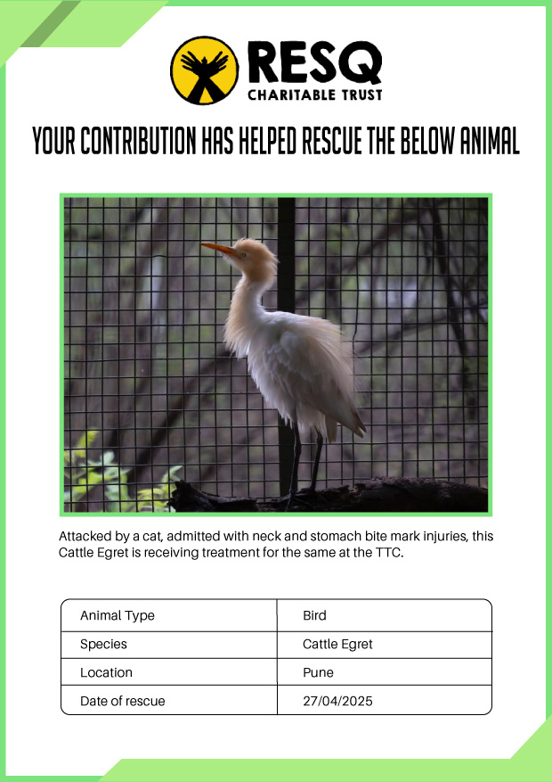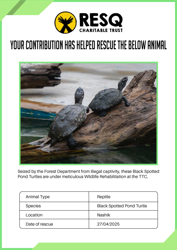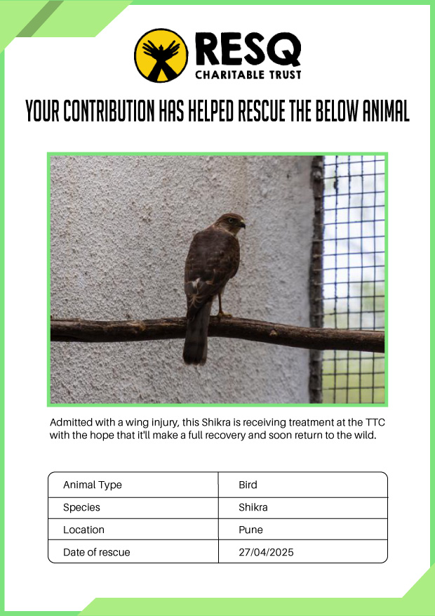 Maharashtra is home to a diverse population of wild animals, many of whom are key species identified to be globally declining. The Pune-based NGO - RESQ provides emergency aid to animals in distress. Thousands of wild animals come to RESQ annually who are either injured, sick, orphaned, or victims of wildlife trafficking and illegal captivity.