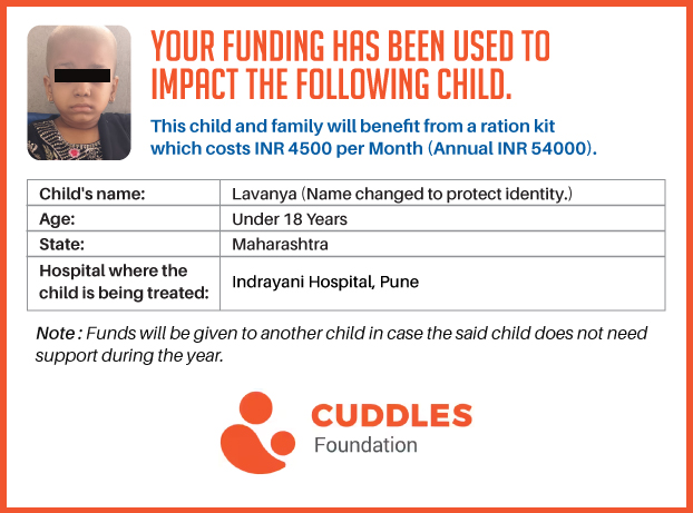 This campaign of mine is being done in partnership with the NGO -Cuddles Foundation and aims to fight hunger and malnutrition in children from low-income homes by giving them a MONTHLY RATION BASKET. This improves their chance of survival by 70% and ultimately does save lives. The baskets are given to children at the Bharti Vidyapeeth Hospital, Deenanath Mangeshkar Hospital, and Indrayani Cancer hospital in Pune.